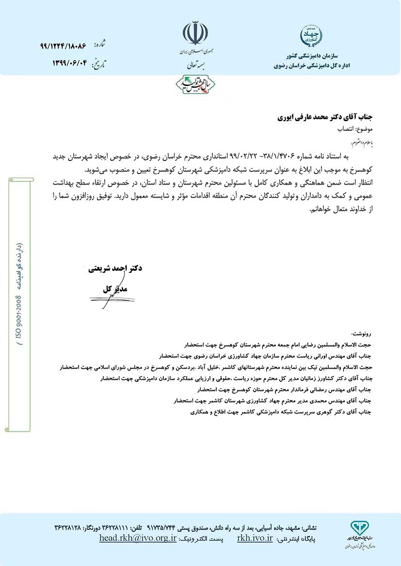 با حکم مدیر کل دامپزشکی استان خراسان رضوی، دکتر محمد عارفی که پیش از این ریاست شبکه دامپزشکی شهرستان کاشمر را عهده دار بود به عنوان رییس شبکه تازه تاسیس کوهسرخ منصوب شد.