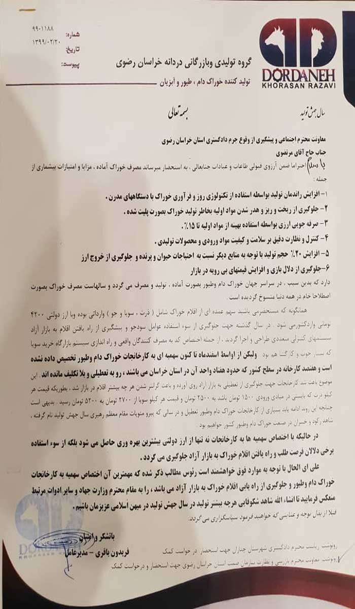 یکی از مدیران صنایع استان خراسان رضوی طی نامه ای به دادگستری استان از عدم تخصیص سهیمه به این کارخانجات در سطح استان اظهار نگرانی کرده و خواستار انعکاس موارد به وزارت جهادکشاورزی و رفع مشکل شده است.