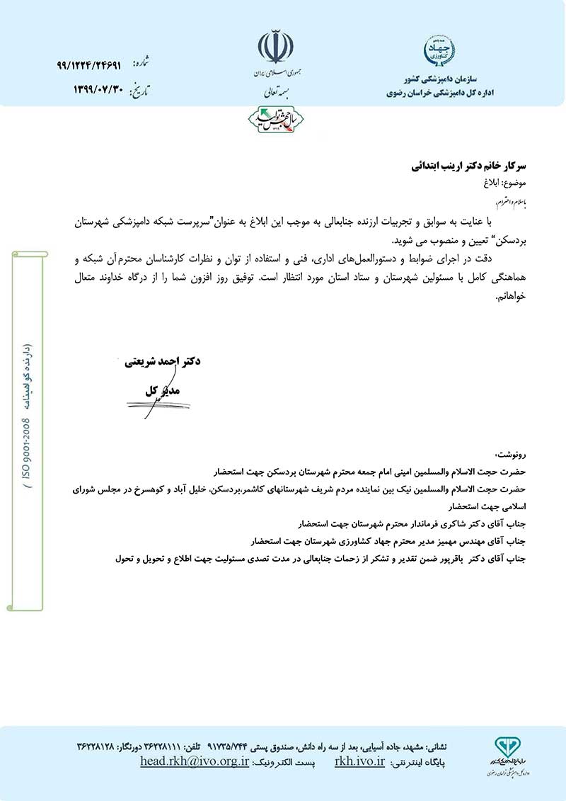 طی حکم صادر شده از سوی مدیر کل دامپزشکی استان خراسان رضوی، دکتر ارینب ابتدایی به عنوان سرپرست شبکه دامپزشکی شهرستان بردسکن منصوب شد.