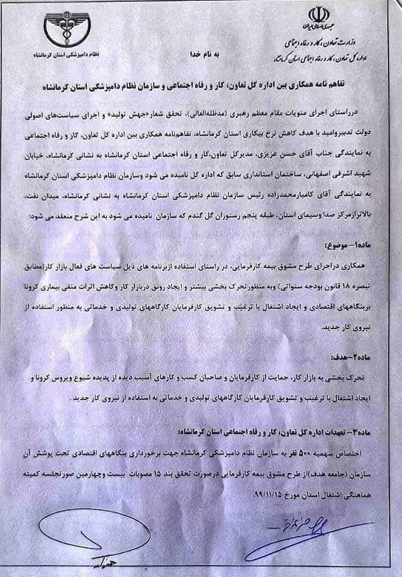 به گزارش فاخته به نقل از کانال اطلاع رسانی روابط عمومی و امور بین الملل سازمان نظام دامپزشکی، تفام نامه همکاری فی مابین نظام دامپزشکی استان کرمانشاه به نمایندگی دکتر محمدزاده رئیس نظام دامپزشکی این استان و اداره کل تعاون، کار و رفاه اجتماعی استان کرمانشاه به نمایندگی آقای حسن عزیزی مدیرکل این اداره منعقد شد.