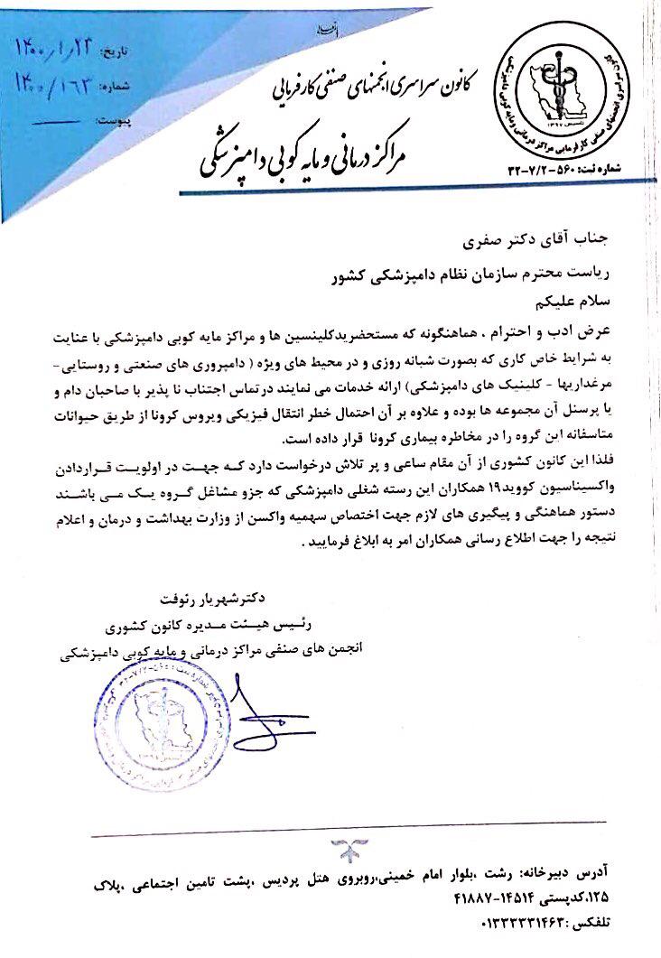 درخواست کانون سراسری انجمن های مراکز درمانی و مایه کوبی دامپزشکی از نظام دامپزشکی