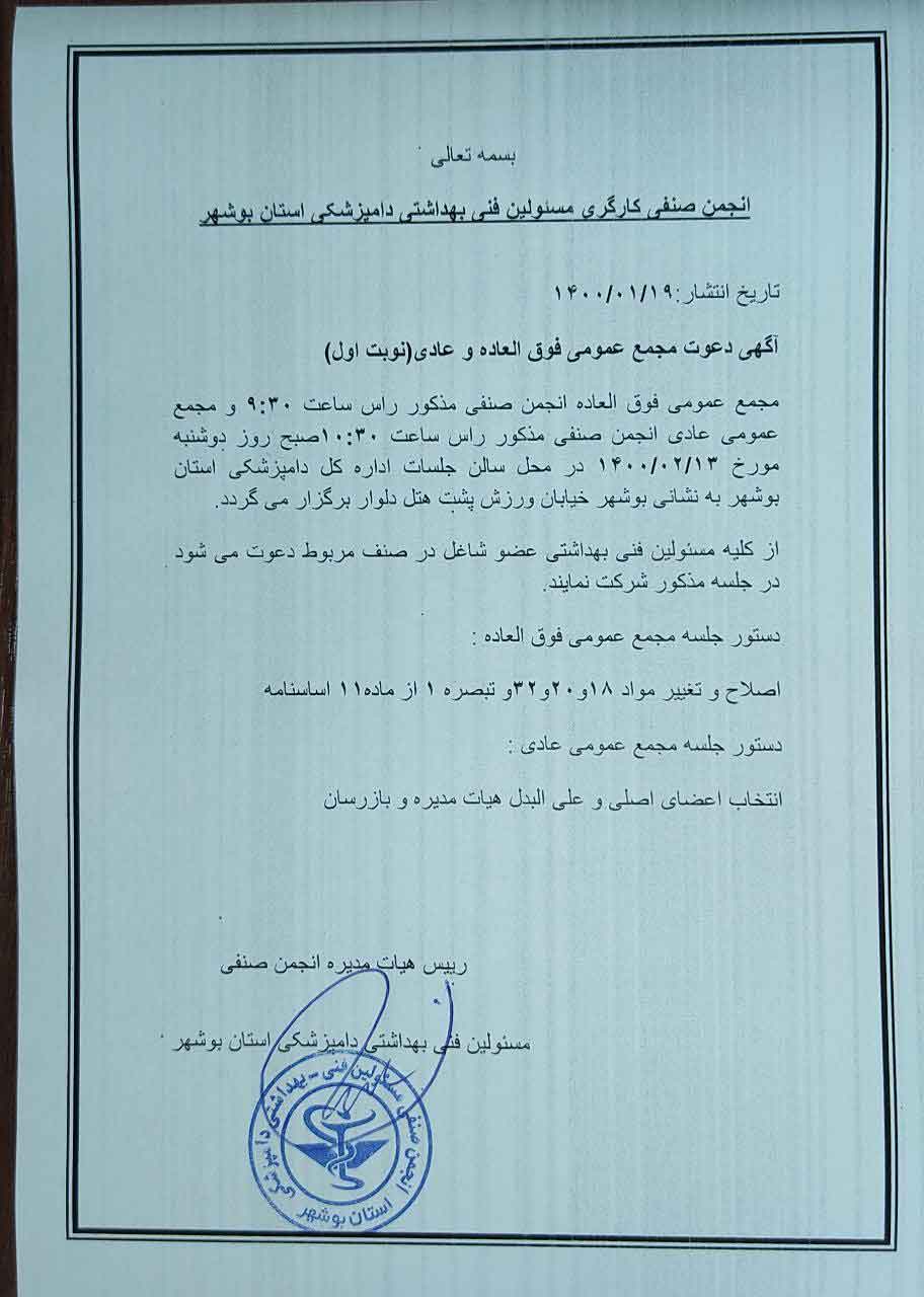آگهی دعوت مجمع عمومی انجمن صنفی مسئولین فنی بهداشتی دامپزشکی استان بوشهر