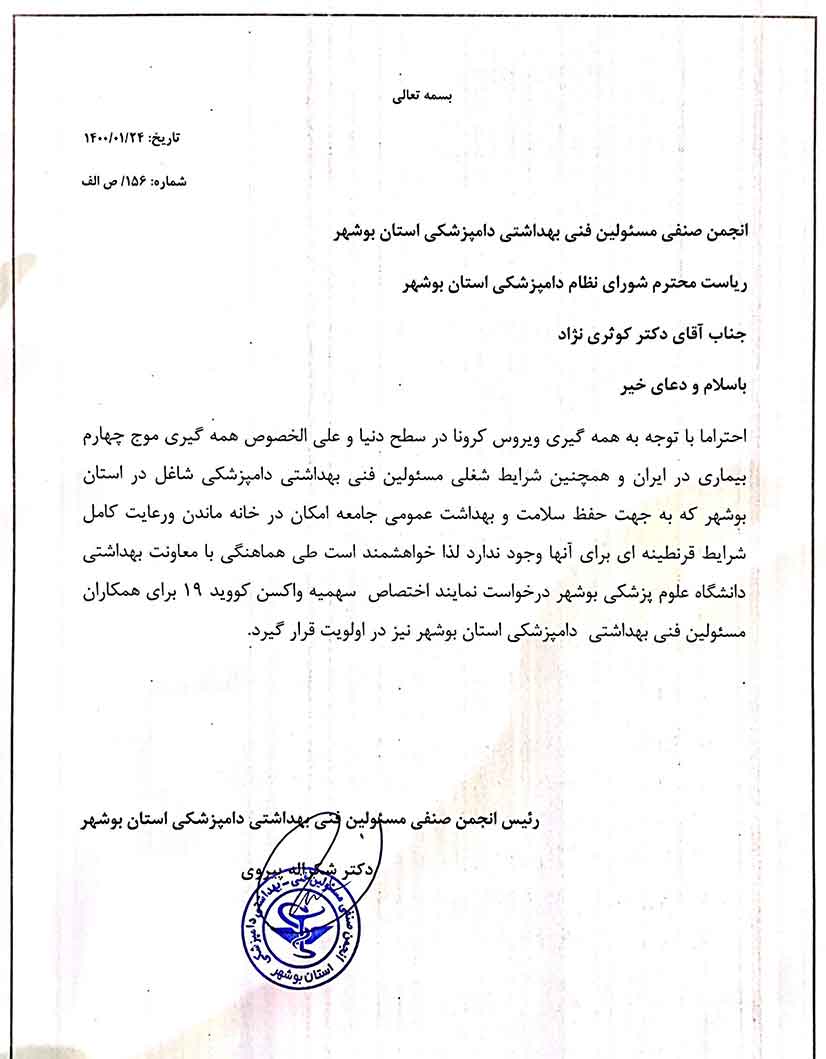 درخواست انجمن صنفی مسئولین فنی بهداشتی دامپزشکی استان بوشهر برای قرارگرفتن در اولویت دریافت واکسن کرونا جهت اعضا