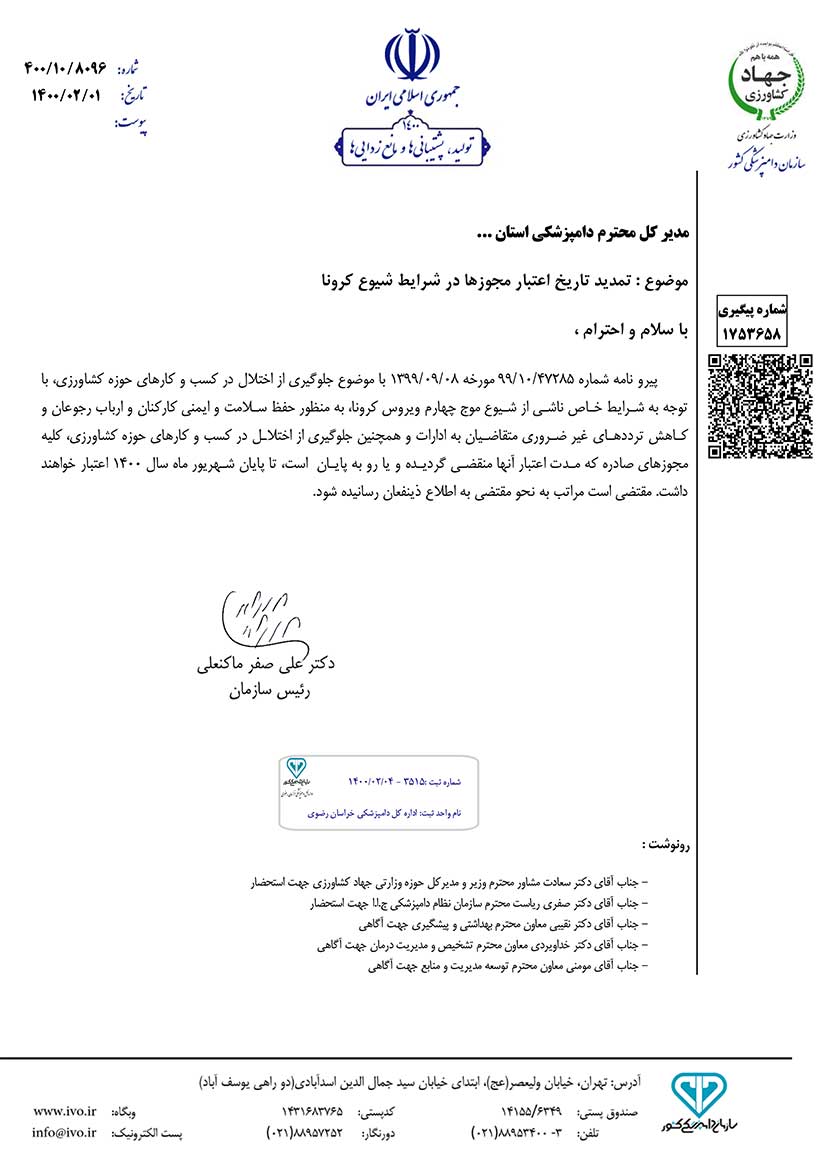 با توجه به شرایط کرونایی کلیه پروانه های منقضی تا پایان شهریورماه 1400 اعتبار دارد