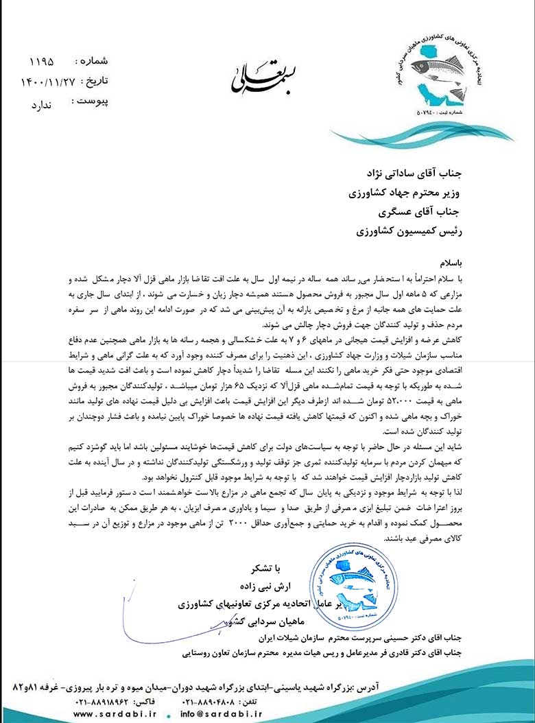 به گزارش فاخته، علیرضا کیهان پور مدیر روابط عمومی اتحادیه مرکزی تعاونی های کشاورزی ماهیان سردآبی ایران در این باره گفت: این اتحادیه در آستانه بازار شب عید نوروز ۱۴۰۱ به منظور ثبات نسبی قیمت ماهی قزل آلای پرورشی در مراکز عرضه شناسنامه دار، از وزیر جهاد کشاورزی، روسای سازمان شیلات ایران و تعاون روستایی کشور تقاضای خرید حمایتی۲ هزارتن ماهی قزل آلا را نموده است که این درخواست و پیشنهاد طبق نامه نگاری مدیر عامل این اتحادیه به پیوست ذیل منعکس شده است: