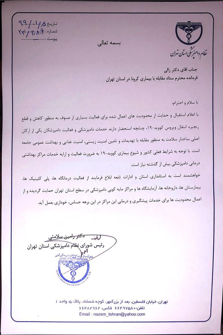 خواهشمند است به استانداری استان و ادارات تابعه ابلاغ فرمایند از فعالیت درمانگاه ها، پلی کلینیک ها، بیمارستان ها، داروخانه ها، آزمایشگاه ها و مراکز مایه کوبی دامپزشکی در سطح استان تهران حمایت گردیده و از اعمال محدودیت ها برای خدمات پیشگیری و درمانی این مراکز در این برهه حساس، خودداری بعمل آید.