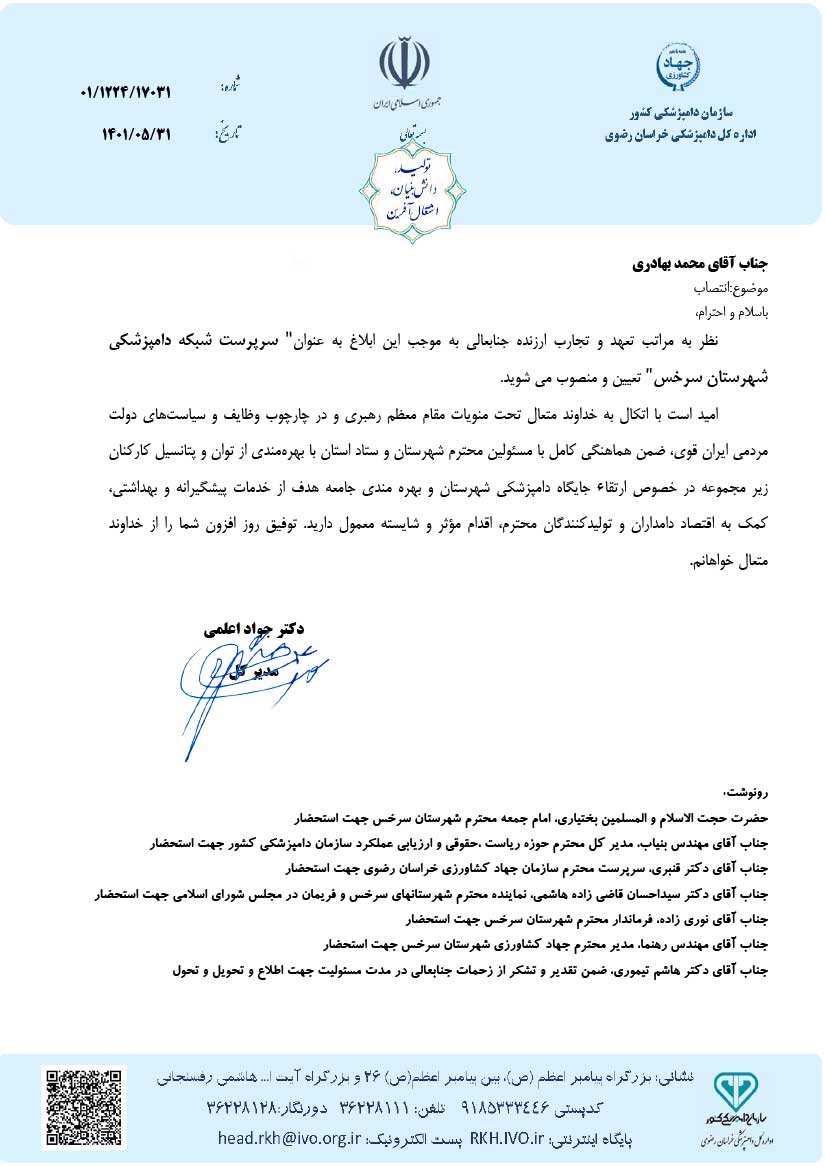 با حکم مدیر کل دامپزشکی استان خراسان رضوی، محمد بهادری به عنوان سرپرست شبکه دامپزشکی شهرستان سرخس منصوب شد.