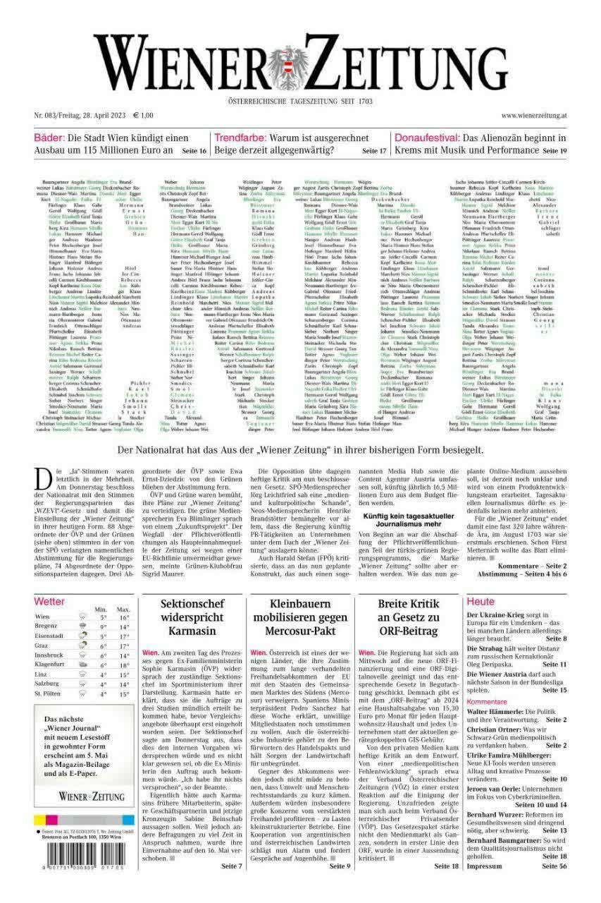 فاخته- روزنامه آلمانی زبان "وینیر سایتونگ" بر فراز دامنه های کوه"آلپ" و رودخانه آبی فام"دانوب" که در شهر "وین" کشور سرسبز "اتریش" از سال ۱۷۰۳ میلادی به طور منظم چاپ می شد پس از ۳۲۰ سال، نسخه چاپی آن از امروز متوقف و " پَر پرواز شَهپر فضای "آنلاین" آن بر سر ۱۹۰ هزار مزرعه و ده هزار کشاورز یک جمعیت حدود ۹/۵ میلیون نفری این کشور" که از نکته نظر مساحت به اندازه کشور امارات متحده عربی است، چترگسترده خود را گسترانید.