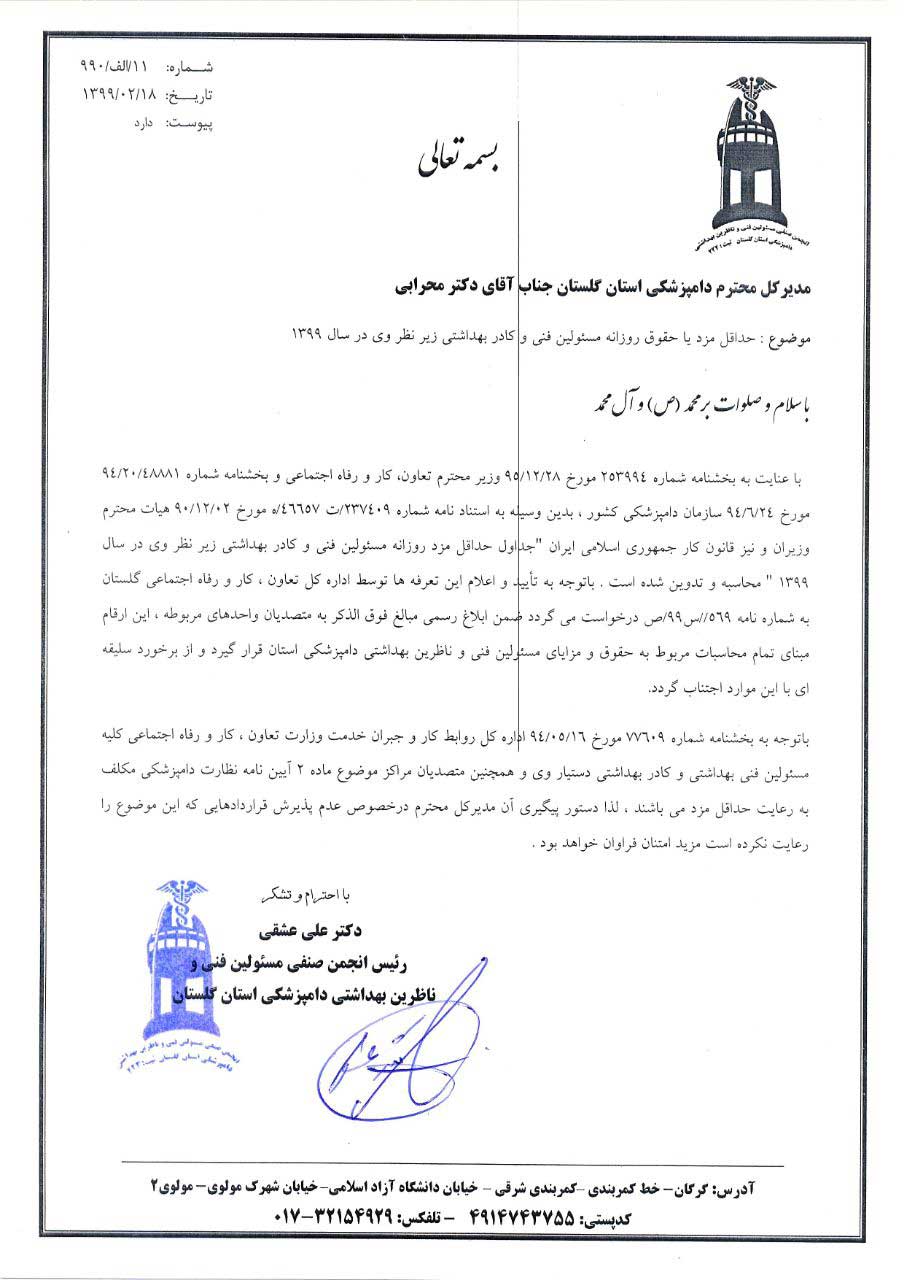 درخواست انجمن صنفی مسئولین فنی و ناظرین بهداشتی دامپزشکی گلستان از مدیر کل دامپزشکی