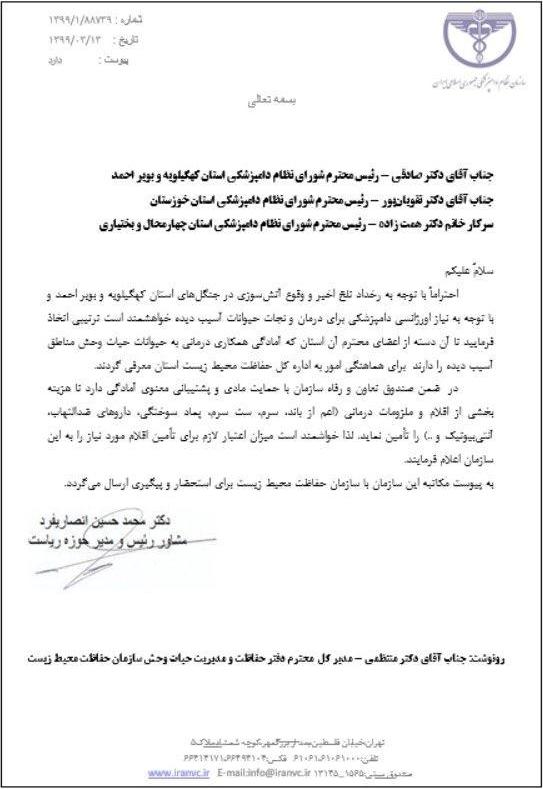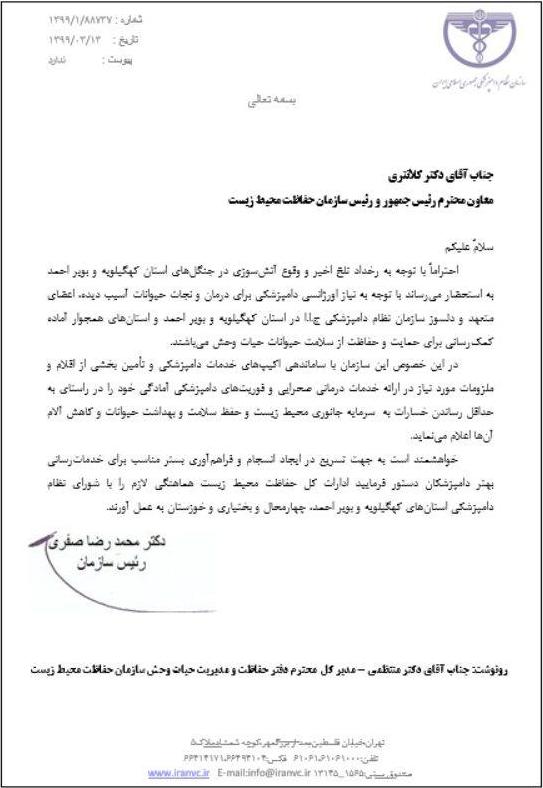 سازمان نظام دامپزشکی جهت همکاری در ارائه کمکهای اورژانسی برای درمان و نجات حیوانات آسیبدیده در آتش سوزی های زاگرس آمادگی خود را اعلام کرد