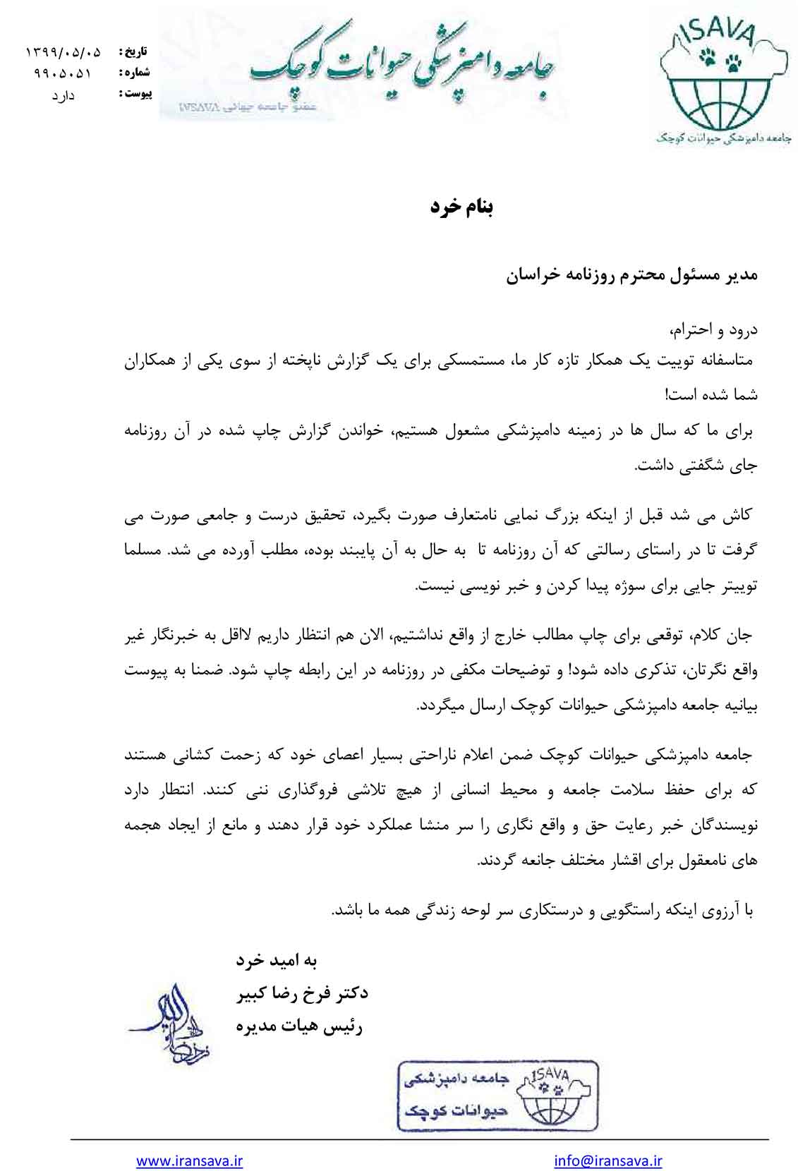 به گزارش فاخته، در متن این جوابیه که نسخه ای از آن در اختیار این پایگاه خبری قرار گرفته، خطاب به روزنامه خراسان آمده است: