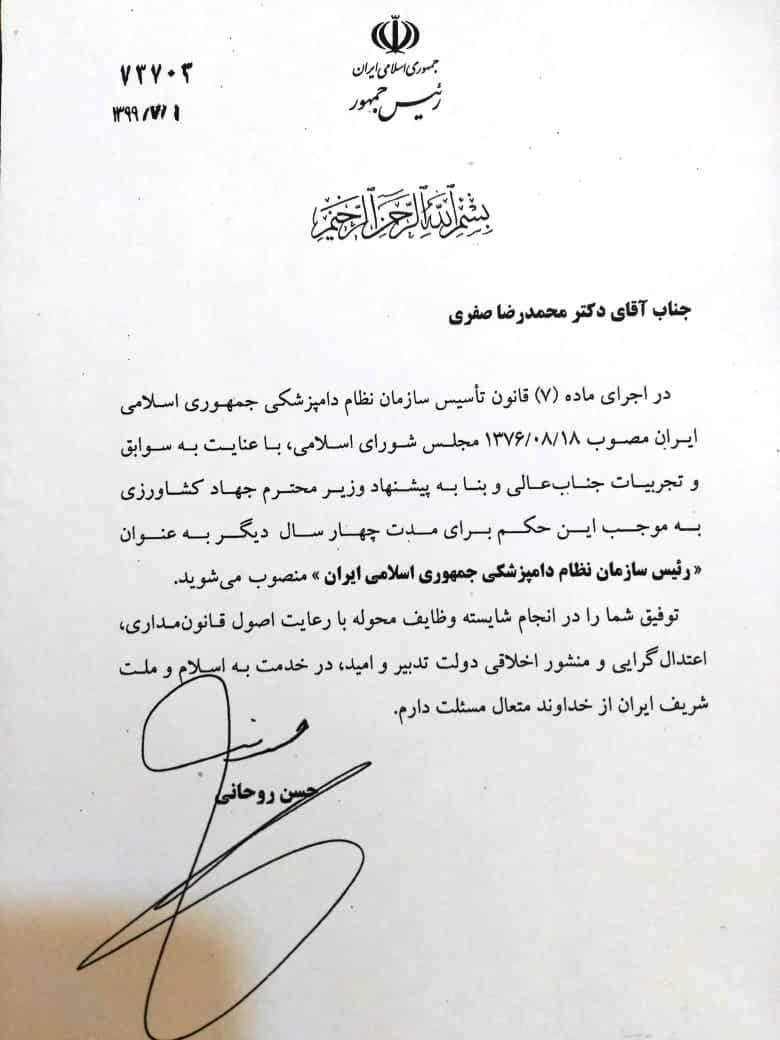 رییس جمهور، طی حکمی، دکتر محمد رضا صفری را به عنوان «رییس سازمان نظام دامپزشکی جمهوری اسلامی ایران» منصوب کرد