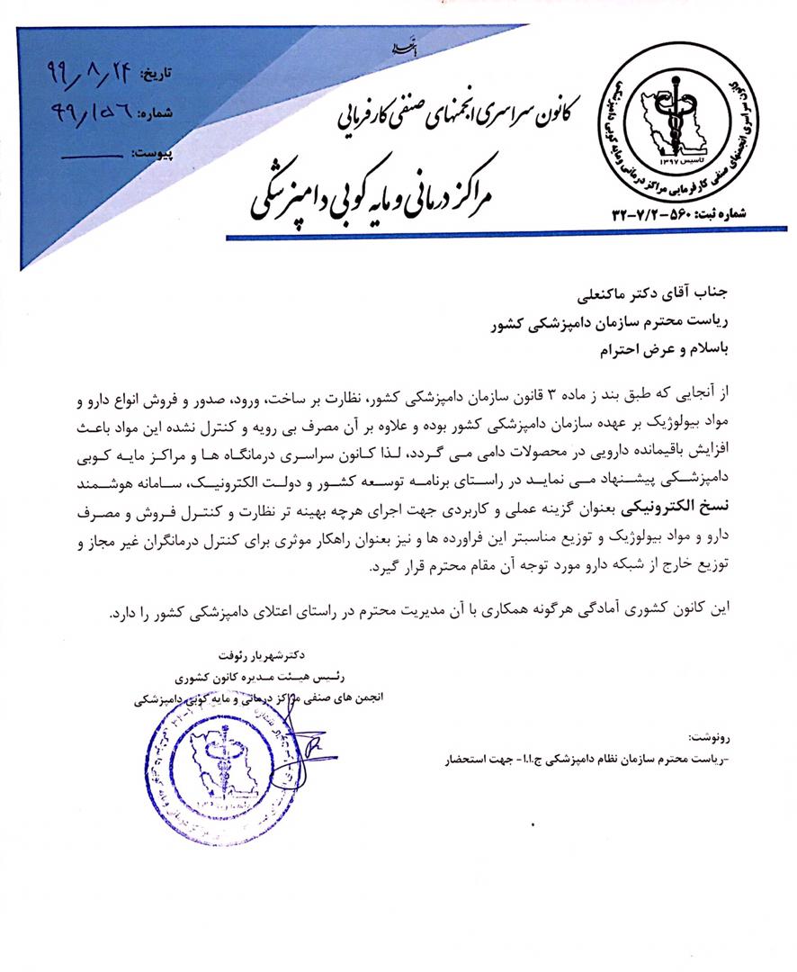 درخواستی خطاب به رییس سازمان دامپزشکی کشور برای کنترل درمانگران غیرمجاز و نظارت بر کنترل فروش و مصرف دارو و مواد بیولوژیک؛ سامانه هوشمند نسخ الکترونیک مورد توجه قرار گیرد