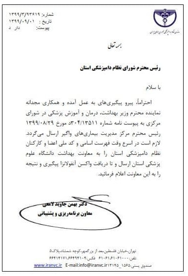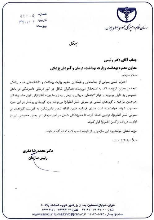 به گزارش فاخته به نقل از روابط عمومی سازمان نظام دامپزشکی،دکتر محمدرضا صفری رییس سازمان نظام دامپزشکی پیشتر در نامه‌ای به وزارت بهداشت، درمان و آموزش پزشکی، خواستار اولویت در دریافت واکسن توسط شاغلین بخش خصوصی دامپزشکی کشور شده بود.