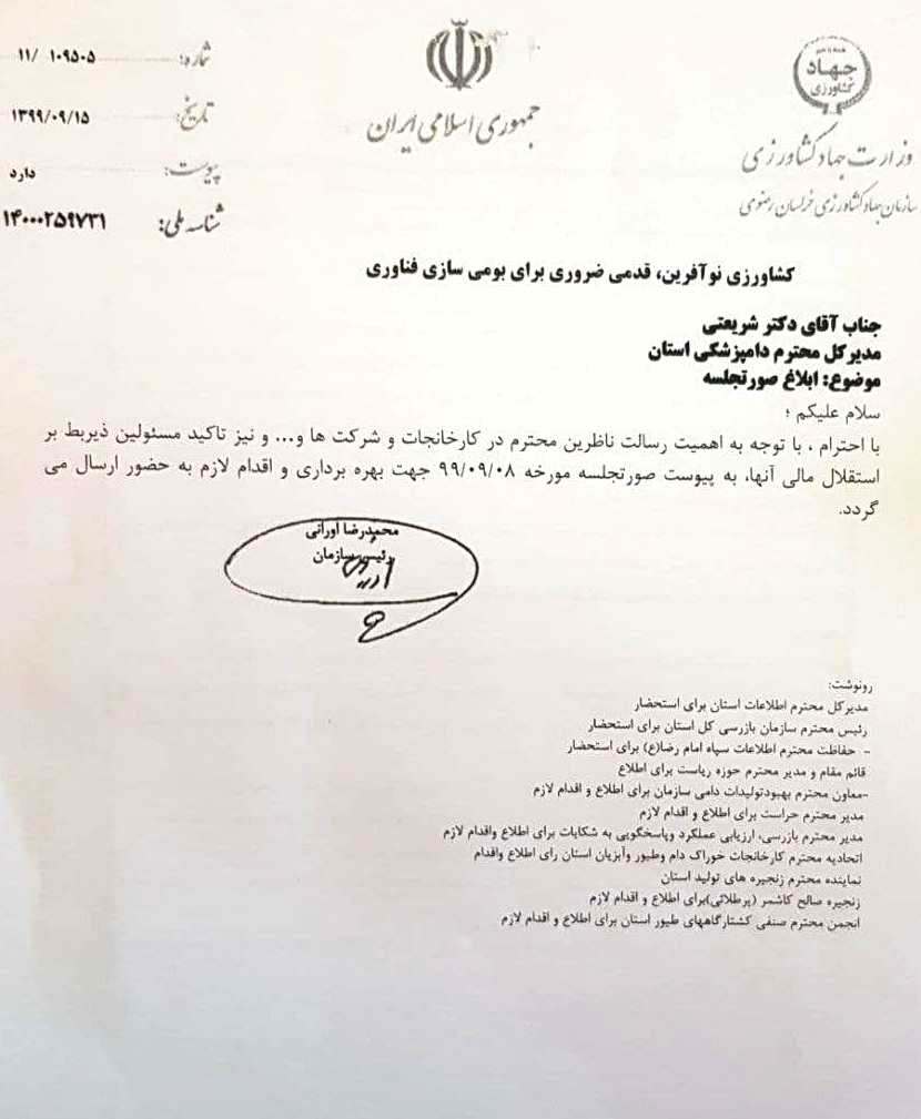 رییس سازمان جهاد کشاورزی دستورالعمل نحوه اجرای ماده ۱۹ آیین‌نامه نظارت بهداشتی دامپزشکی را به دستگاه‌ها، اتحادیه‌ها و انجمن‌های مربوطه ابلاغ کرد