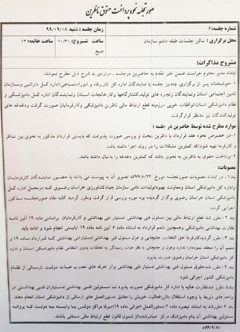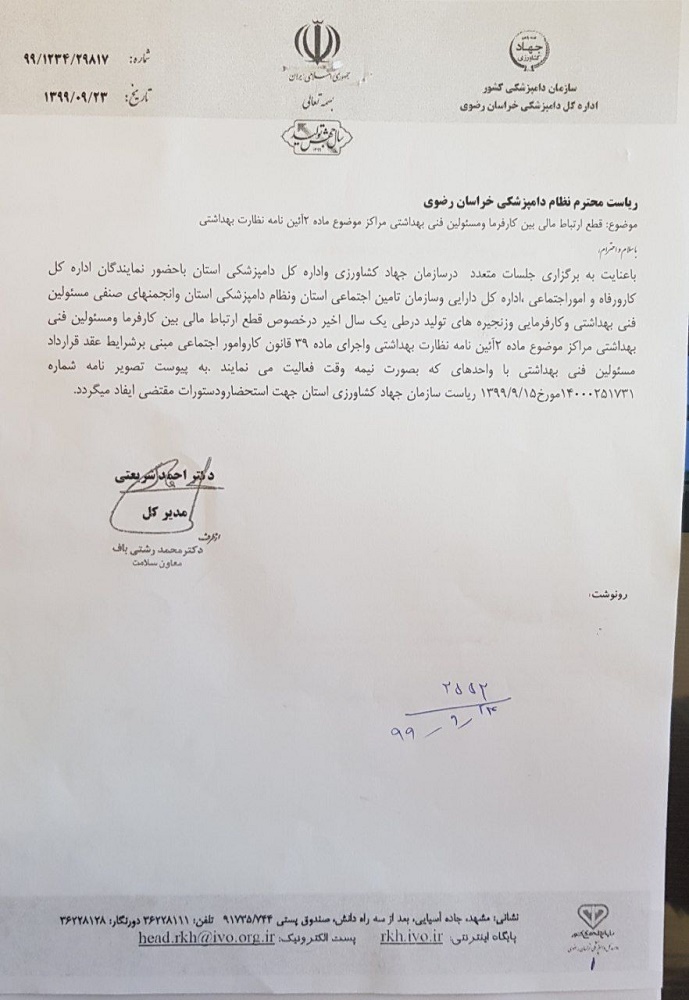 به گزارش فاخته به نقل از روابط عمومی نظام دامپزشکی استان خراسان رضوی، در اطلاعیه ای که در کانال این نهاد منتشر شده آمده است: پس از تشکیک انجمن های محترم کارفرمایی و شکایت به دستگاه های نظارتی در ارتباط با اجرای قانون ماده ۱۹ توسط نظام دامپزشکی از مورخ ۹۸/۱۰/۰۱ و طی جلسات متمادی و دفاع خوب و هماهنگ نظام دامپزشکی و اداره کل دامپزشکی ، دستورالعمل لازم توسط رییس سازمان جهاد کشاورزی که همان صورتجلسه نهایی در حضور همه اعضا و کمیته بررسی بود ابلاغ گردید.