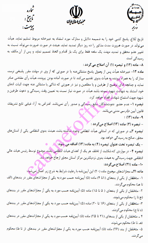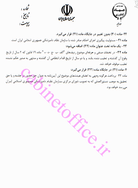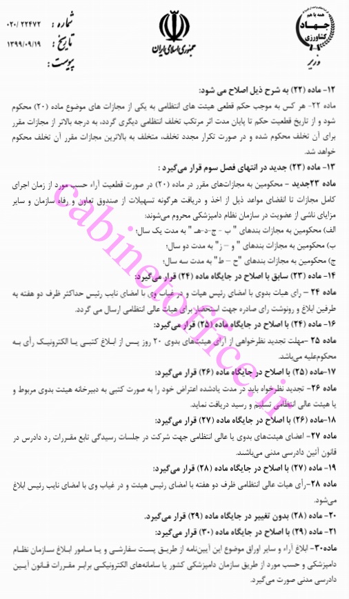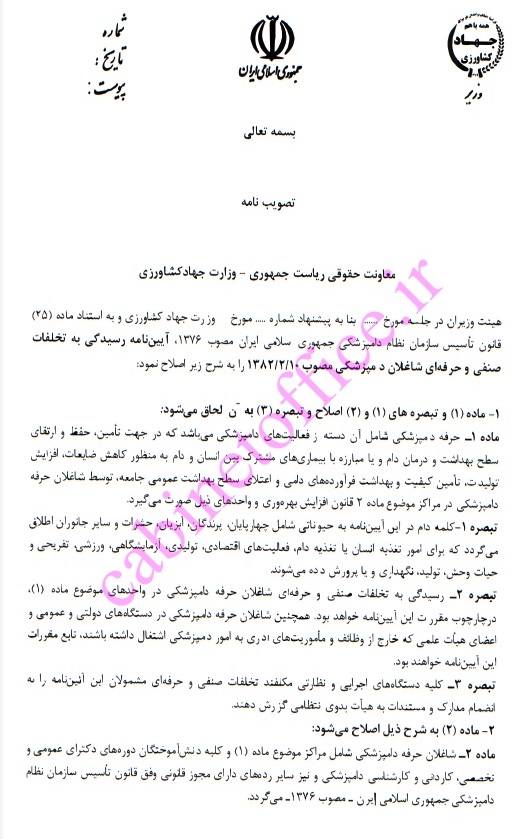 وزارت جهاد کشاورزی به استناد ماده (۲۵) قانون تشکیل سازمان نظام دامپزشکی جمهوری اسلامی ایران (مصوب ۱۳۷۶) پیشنهاد اصلاح آیین نامه رسیدگی به تخلفات صنفی و حرفه‌ای شاغلان حرفه دامپزشکی را جهت سیر مراحل بررسی و تصویب، به هیئت دولت ارایه کرده است.
