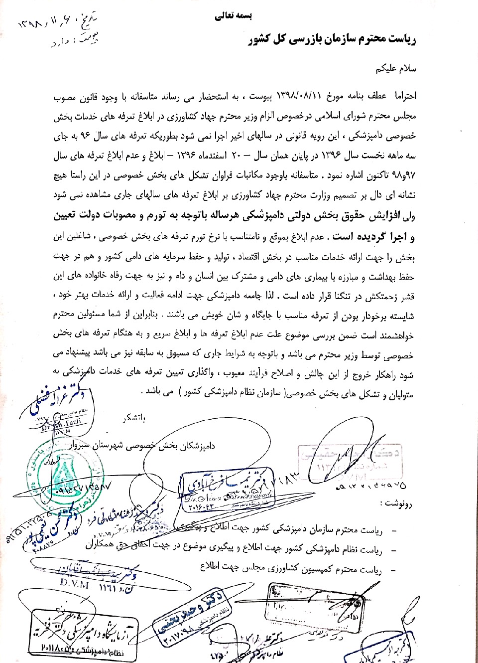 دامپزشکان شهرستان سبزوار این بار اعتراض خود را نه به وزارت جهاد که به سازمان بازرسی کل کشور بردند.