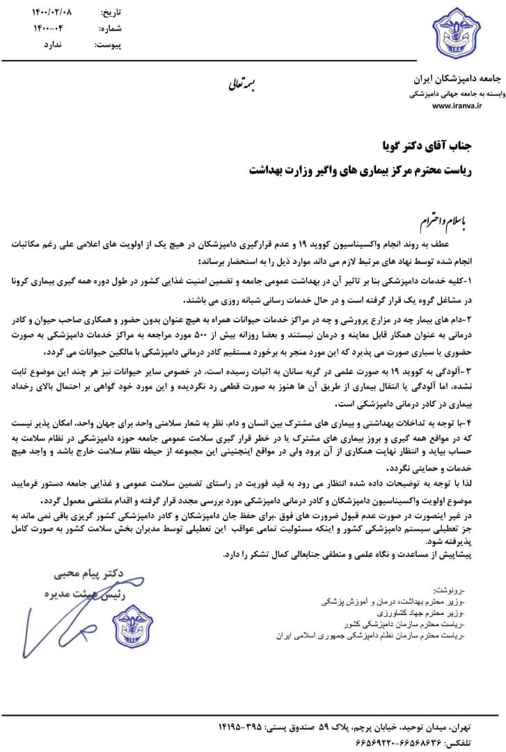 رئیس جامعه دامپزشکان ایران در نامه ای سرگشاده به رئیس مرکز بیماری های واگیر وزارت بهداشت یادآور شد، در صورت در اولویت قرار نگرفتن دامپزشکان در واکسیناسیون کووید ۱۹ چاره ای جز تعطیلی سیستم دامپزشکی کشور نمی ماند.