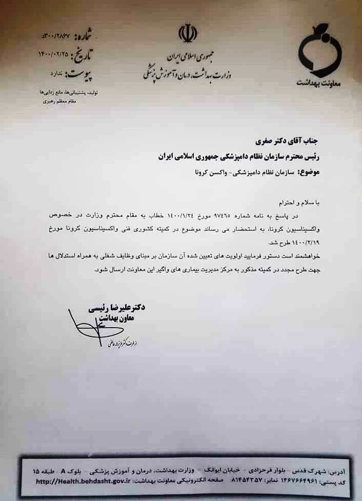 وزارت بهداشت در پاسخ به نامه سازمان نظام دامپزشکی عنوان داشت: موضوع واکسیناسیون کرونا برای شاغلین حرف دامپزشکی در کمیته کشوری فنی واکسیناسیون طرح شده است.
