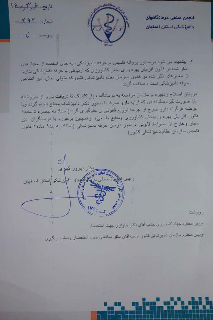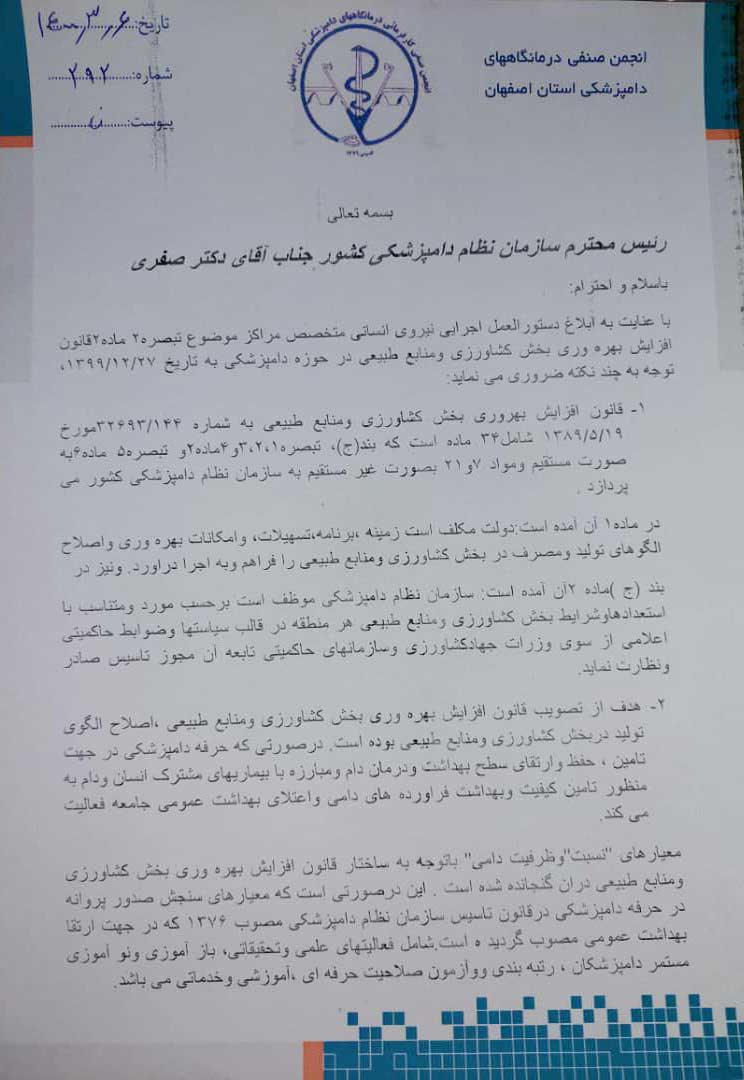 در نامه رییس انجمن صنفی درمانگاه های دامپزشکی استان اصفهان مطرح شد: