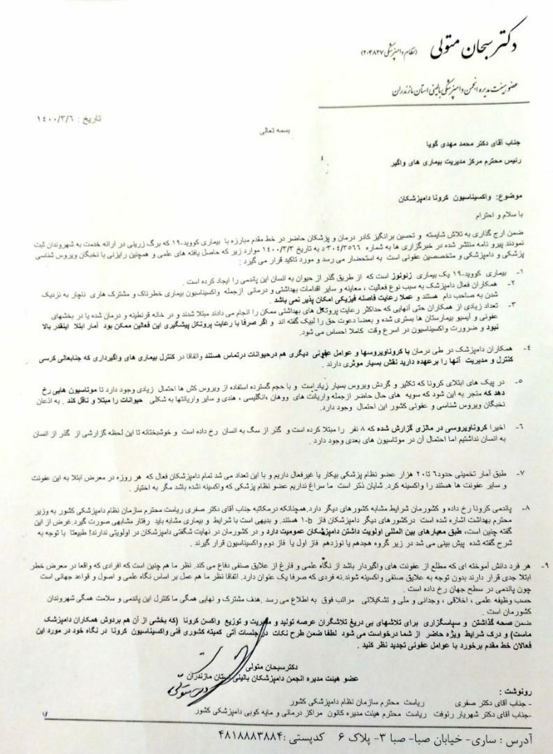 در نامه عضو هیات مدیره انجمن دامپزشکی بالینی مازندران خطاب به وزارت بهداشت عنوان شد: