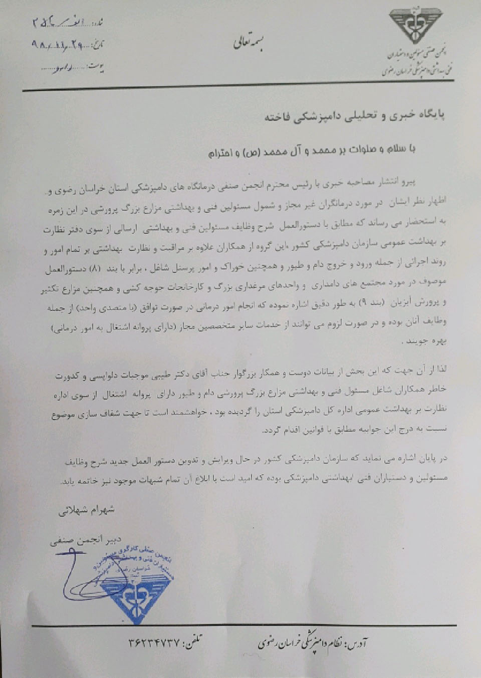 جوابیه انجمن صنفی کارگری مسولین و دستیاران فنی و بهداشتی خراسان رضوی به مصاحبه رئیس انجمن صنفی درمانگاه های دامپزشکی استان