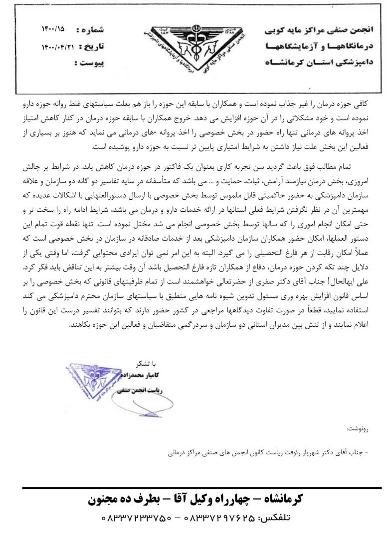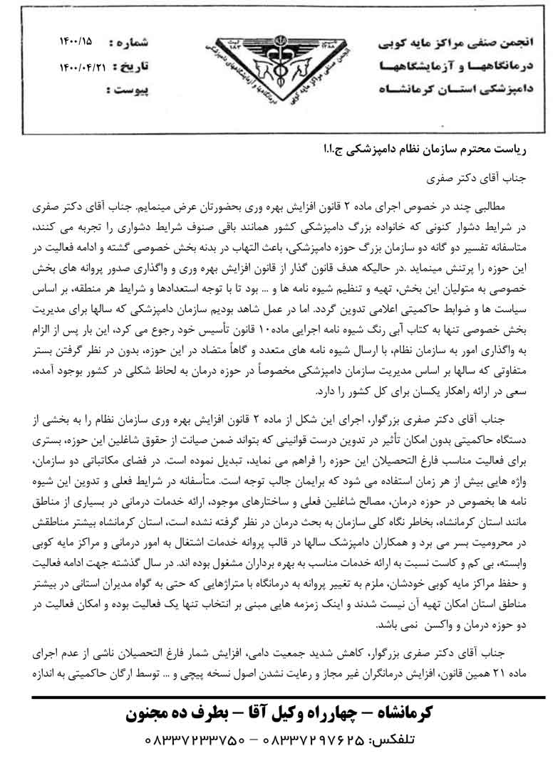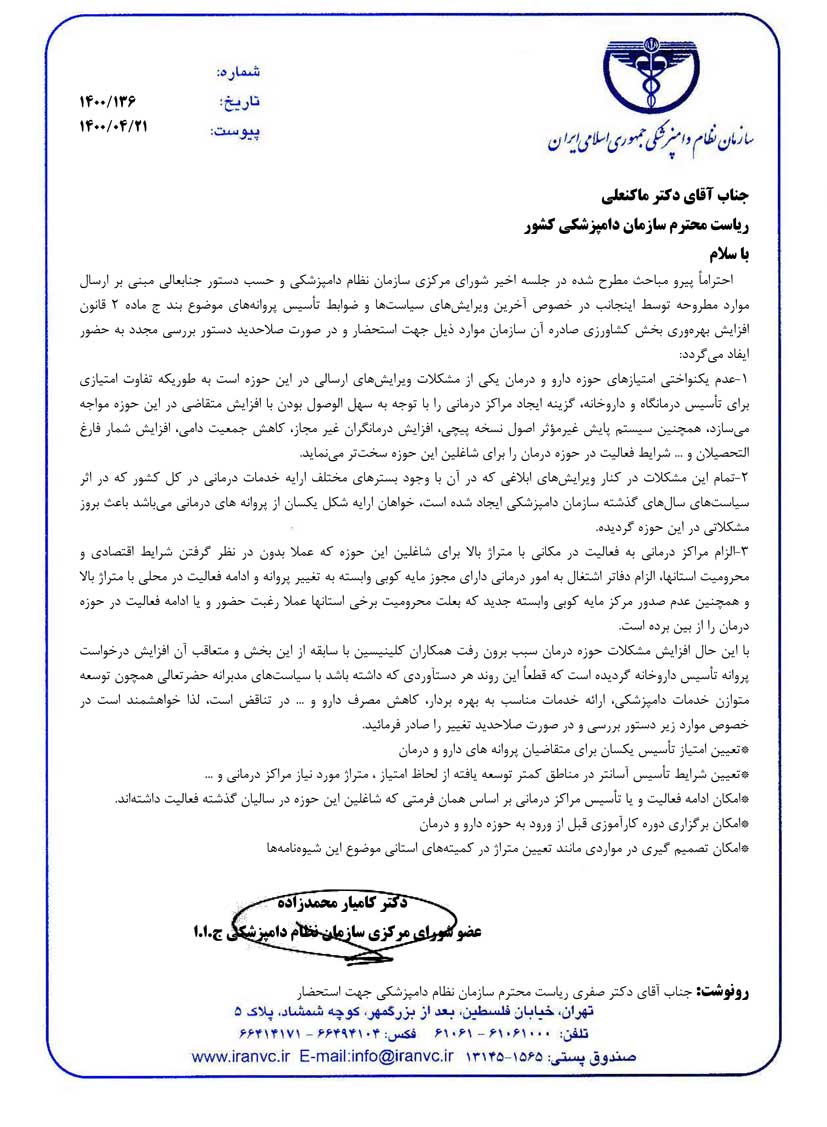 عضو شورای مرکزی نظام دامپزشکی در نامه ای به روسای سازمان های دامپزشکی ونظام دامپزشکی: