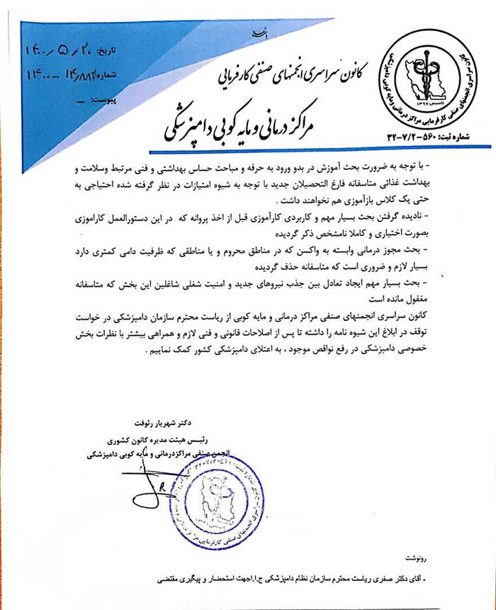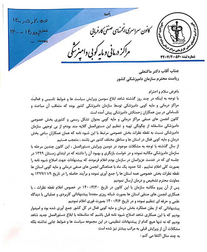 رییس هیات مدیره کانون سراسری انجمن های صنفی کارفرمایی مراکز درمانی و مایه کوبی دامپزشکی کشور با ارسال نامه ای به رییس سازمان دامپزشکی کشور از ابلاغ سومین ویرایش سیاست ها و ضوابط تاسیس و فعالیت مراکز درمانی و مایه کوبی توسط آن سازمان انتقاد کرد.