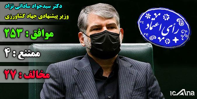 نمایندگان مجلس با 253 رای موافق، 27 رای مخالف، 4 رای ممتنع در صحن تصدی وزارت جهاد کشاورزی را به ساداتینژاد سپردند.