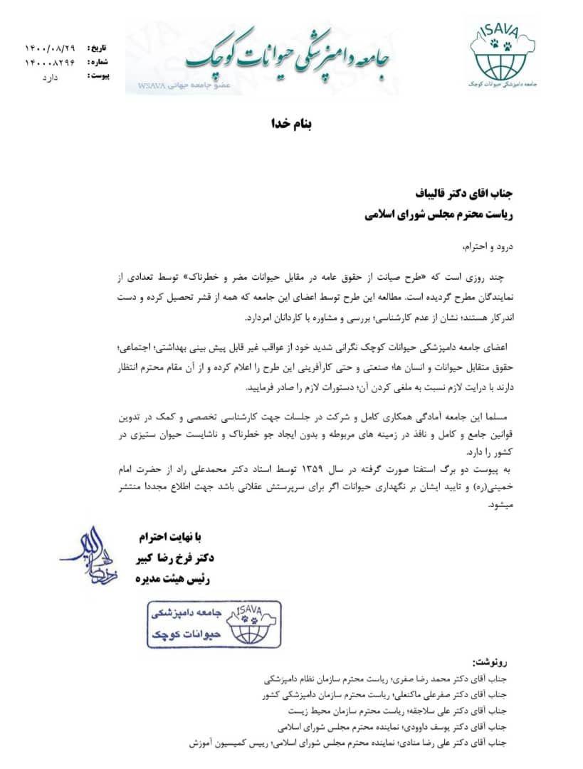 نامه سرگشاده رئیس هیئت مدیره جامعه دامپزشکی حیوانات کوچک به رئیس مجلس:
