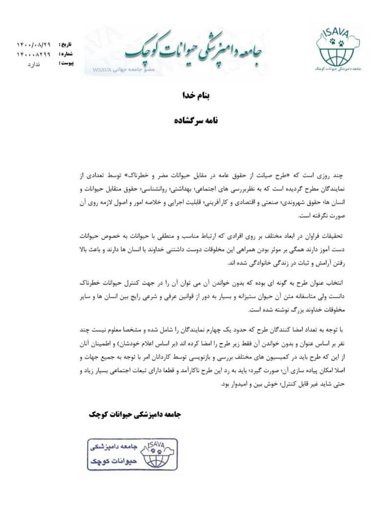 رئیس هیئت مدیره جامعه دامپزشکی حیوانات کوچک با صدور نامه ای به رئیس مجلس خواستار آن شد تا نسبت به لغو طرح صیانت از حقوق عامه در مقابل حیوانات اقدام شود.