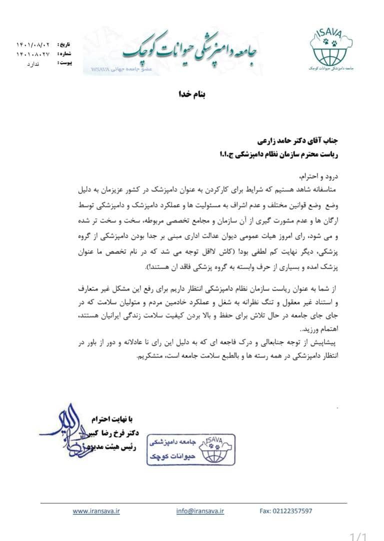 رئیس جامعه دامپزشکی حیوانات کوچک در نامه هایی جداگانه به روسای سازمان های دامپزشکی و نظام دامپزشکی گلایه شدید خود را از رای دیوان عدالت اداری عنوان داشت.