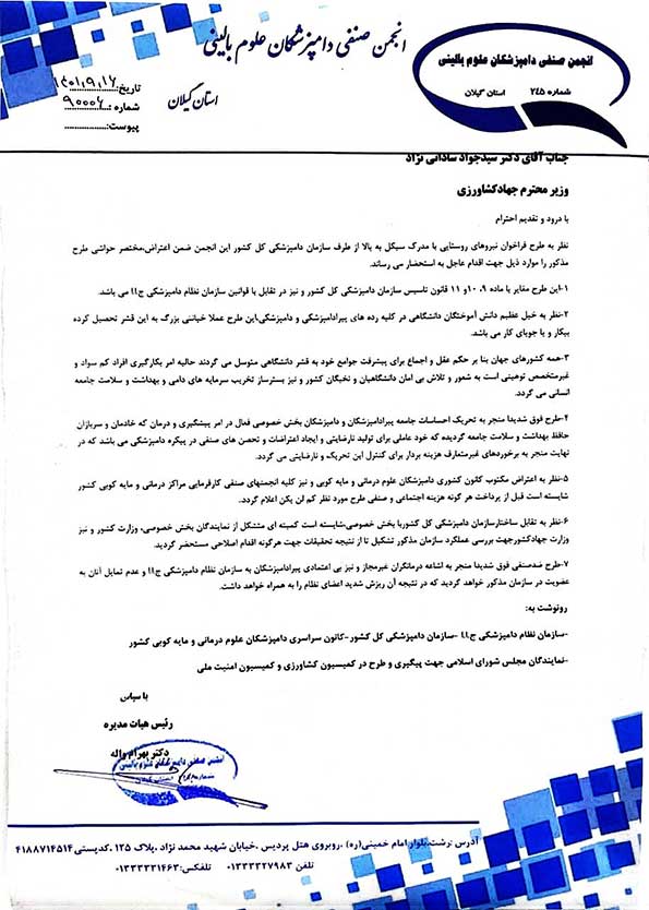 رئیس نظام دامپزشکی گیلان و رئیس انجمن صنفی دامپزشکان علوم بالینی گیلان در نامه هایی جداگانه به رئیس سازمان نظام دامپرشکی و وزیر جهاد کشاورزی به طرح بکارگیری نیروهای سیکل به بالا جهت واکسیناسیون در روستاها واکنش نشان دادند.