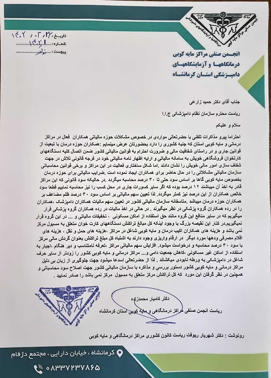انجمن صنفی مراکز مایه کوبی، درمانگاه ها و آزمایشگاه های دامپزشکی استان کرمانشاه با انتشار نامه ای به سازمان نظام دامپزشکی، نسبت به ضرایب بالای مالیاتی برای گروه درمانی و مایه کوبی دامپزشکی واکنش نشان داد.