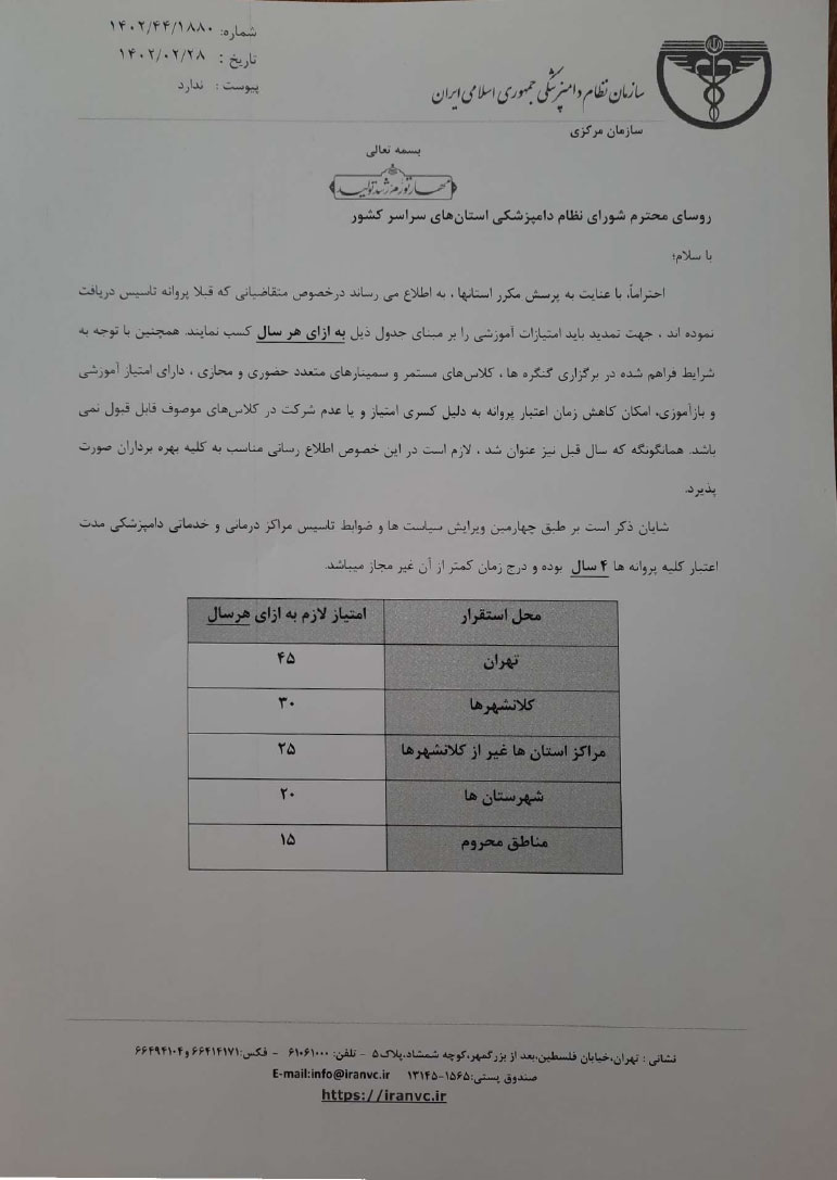 رئیس انجمن صنفی دامپزشکان علوم بالینی گیلان با صدور نامه ای اعتراض خود را نسبت به ضرایب در نظر گرفته شده جهت تمدید پروانه بهداشتی اعلام کرد.