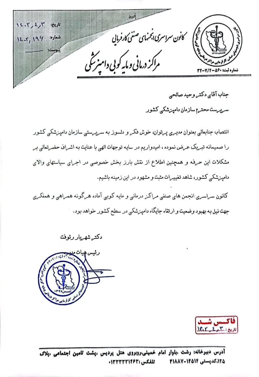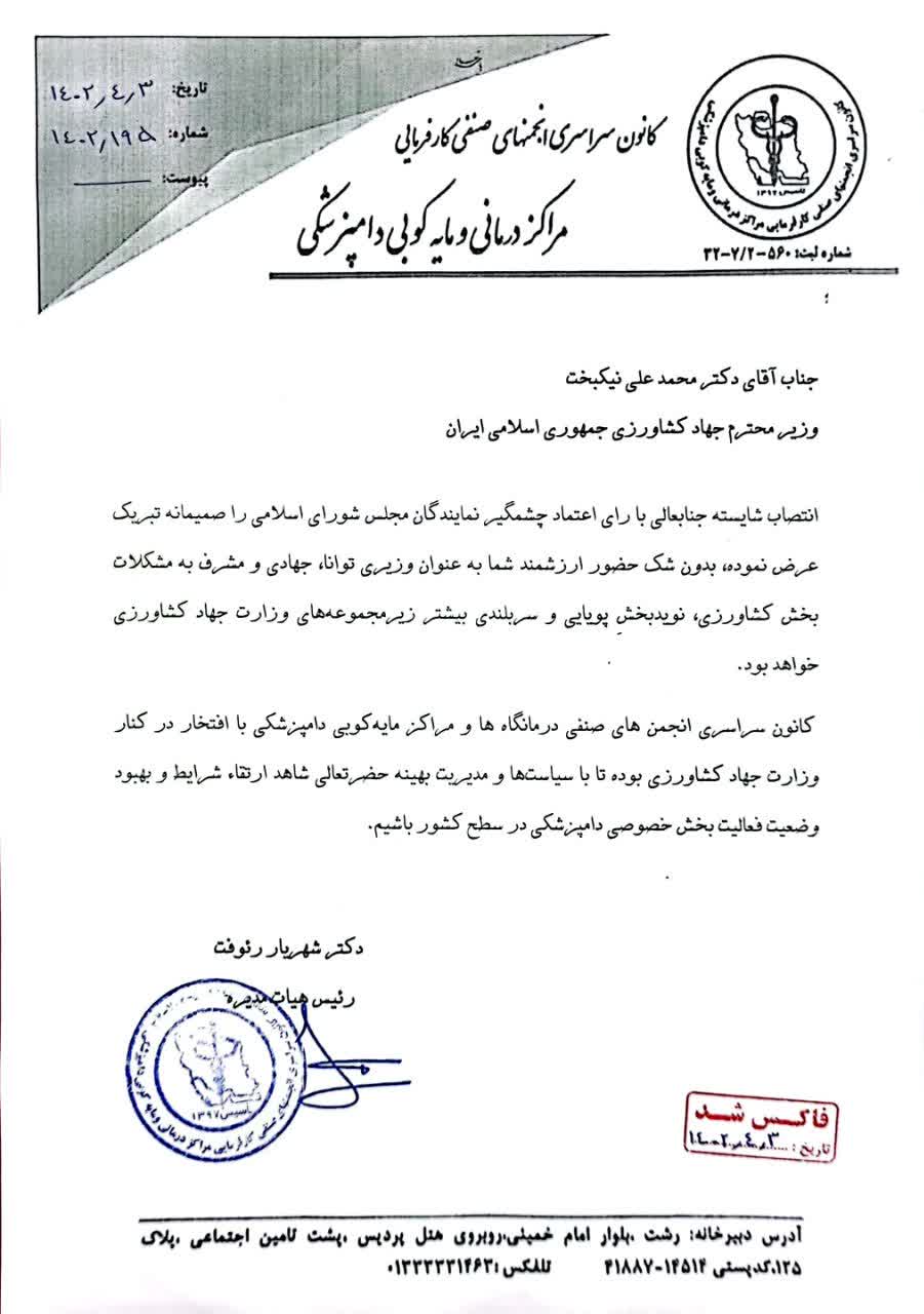 رئیس هیات مدیره کانون انجمن های صنفی کارفرمایی مراکز درمانی و مایه کوبی کشور، به وزیر جهاد و سرپرست سازمان دامپزشکی کشور تبریک گفت.