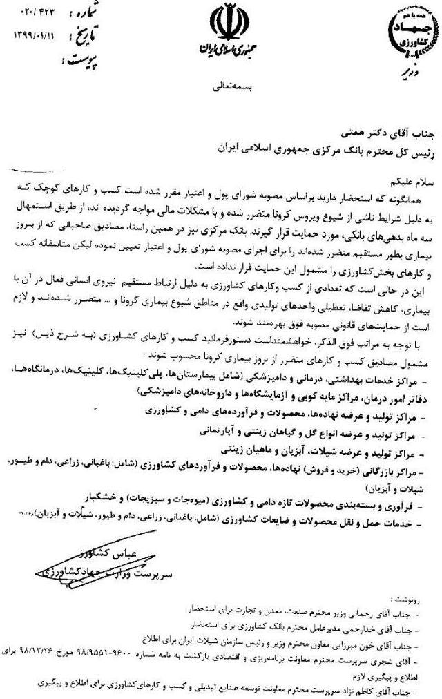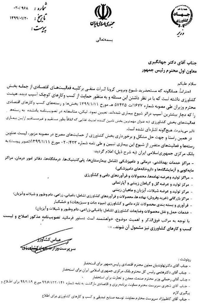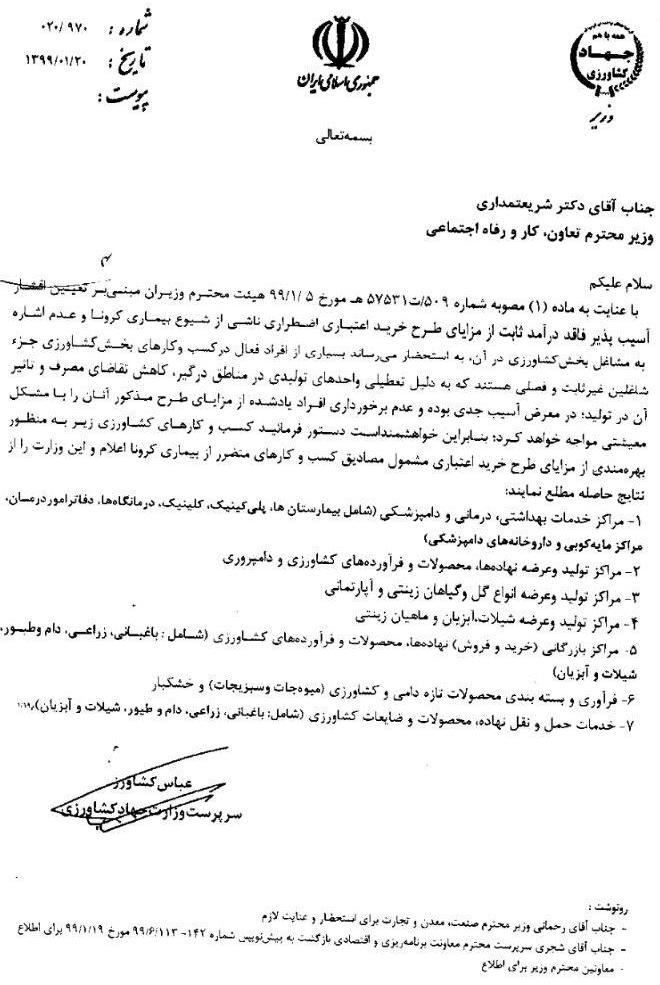 سرپرست وقت وزارت جهاد کشاورزی و مشاور کنونی این وزارتخانه طی مکاتباتی جداگانه با معاون اول رئیس جمهور، وزیر تعاون، کار و رفاه اجتماعی و رئیس کل بانک مرکزی بر ضرورت بهره‌مندی مراکز خدمات بهداشتی و درمانی دامپزشکی نظیر؛ بیمارستان‌ها، پلی‌کلینیک‌ها، درمانگاه‌ها، دفاتر امور درمان، مراکز مایه‌کوبی، آزمایشگاه‌ها و داروخانه‌های دامپزشکی از مزایای طرح خرید اعتباری مشمول مصادیق کسب و کارهای آسیب‌دیده از بیماری کرتاکید کرد.