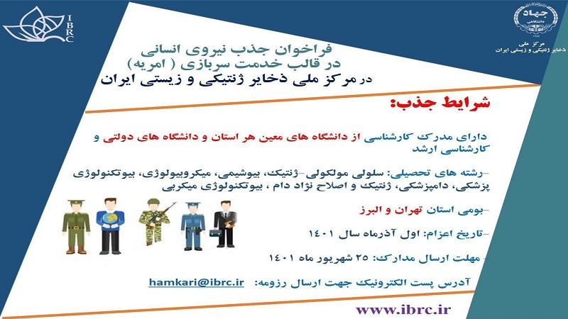 مرکز ملی ذخایر ژنتیکی و زیستی ایران وابسته به جهاددانشگاهی به منظور تکمیل کادر نیروی انسانی متخصص خود، از میان فارغ التحصیلان کارشناسی وکارشناسی ارشد رشته های ژنتیک، بیوشیمی، میکروبیولوژی، بیوتکنولوژی پزشکی، بیوتکنولوژی میکربی، دامپزشکی، ژنتیک و اصلاح نژاد دام؛ اقدام به جذب نیروی امریه می کند.