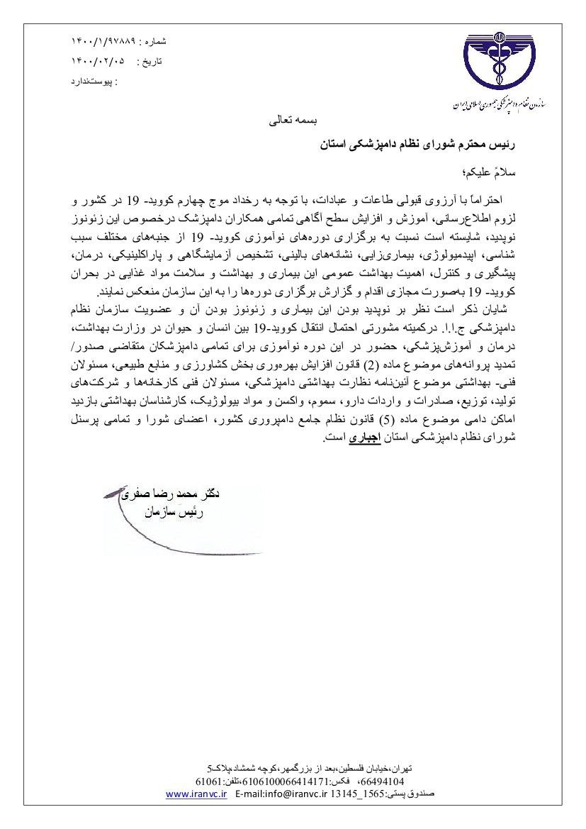 رئیس سازمان نظام دامپزشکی با صدور نامهای به روسای نظام دامپزشکی سراسر کشور، تمامی دامپزشکان متقاضی دریافت پروانههای خدمات دامپزشکی، مسئولین فنی، مسئولین فنی بهداشتی، کارشناسان بهداشتی بازدید از اماکن دامی و تمامی پرسنل و اعضای شوراهای نظامهای دامپزشکی را ملزم به حضور در دورههای آموزشی مربوط به کووید- ۱۹ نمود.