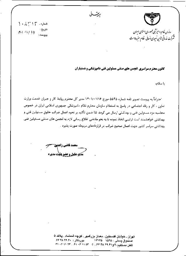 استعلام سازمان نظام دامپزشکی از وزارت تعاون، کار و رفاه اجتماعی در خصوص نحوه محاسبه دستمزد مسئولین فنی بهداشتی