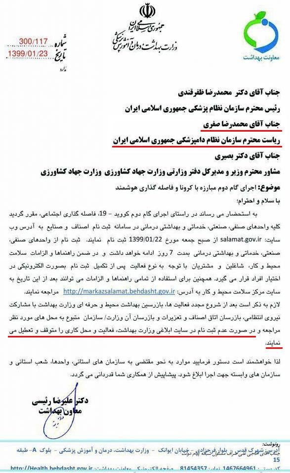 در این خصوص نیز به نظامهای دامپزشکی استان اعلام شده تا از مراجع ذیصلاح استانی در موضوع ثبت نام در سامانه استعلام نمایند که بر اساس گزارشهای واصله در برخی استانها مراجع ذیربط استانی بعضاً نقطه نظرات متفاوت و گاه متناقضی در این خصوص اعلام داشتهاند که در هر صورت رعایت ضوابط ابلاغی ستادهای استانی مقابله با کرونا همچنان مورد تاکید میباشد.