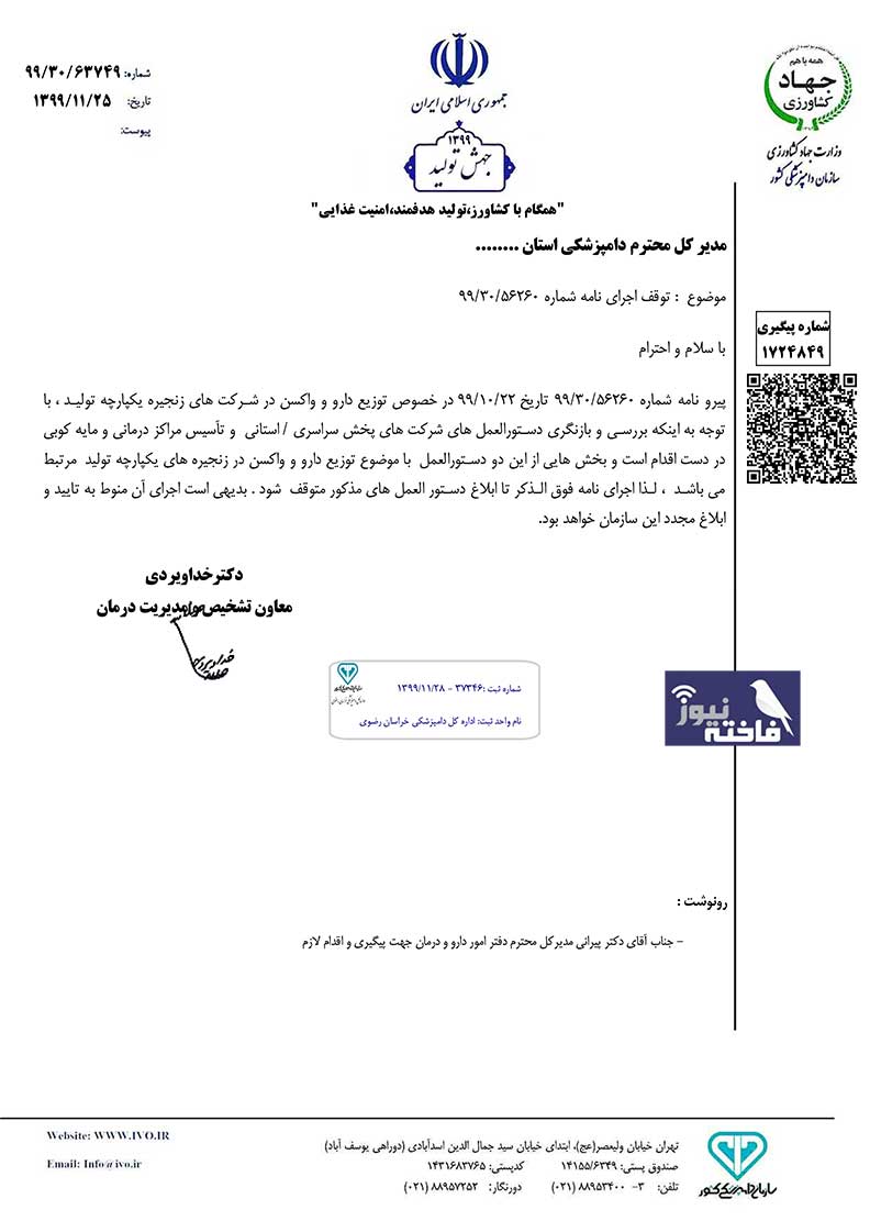 دکتر خالد خداویردی، معاون تشخیص و درمان سازمان دامپزشکی کشور با صدور نامه ای، مکاتبه قبلی این سازمان درباره شیوه توزیع دارو و واکسن در شرکتهای زنجیره یکپارچه تولید را متوقف کرد.