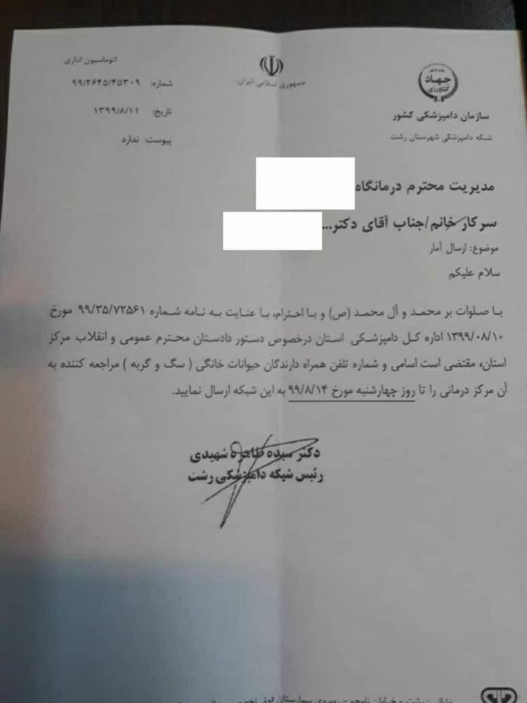 به گزارش فاخته، گیل خبر دراین باره نوشت؛ به دنبال انتشار تصویر نامه ای از سازمان دامپزشکی استان گیلان خطاب به کلینیکهای دامپزشکی مبنی بر ارائه شمارهی کسانی که حیوان خانگی دارند، «مصطفی اکبرپور» رئیس دفتر ریاست سازمان دامپزشکی گفت: بنده مشخصاً درباره این نامه اطلاعی ندارم اما به طور کلی در کلینیک های دامپزشکی سراسر کشور پرونده های حیوانات خانگی به صورت اطلاعات پزشکی یا نسخه نویسی آن حیوان موجود است تا در صورت لزوم همه دامپزشکی های سراسر کشور به اطلاعات حیوان خانگی جهت درمان و رسیدگی، دسترسی داشته باشند.