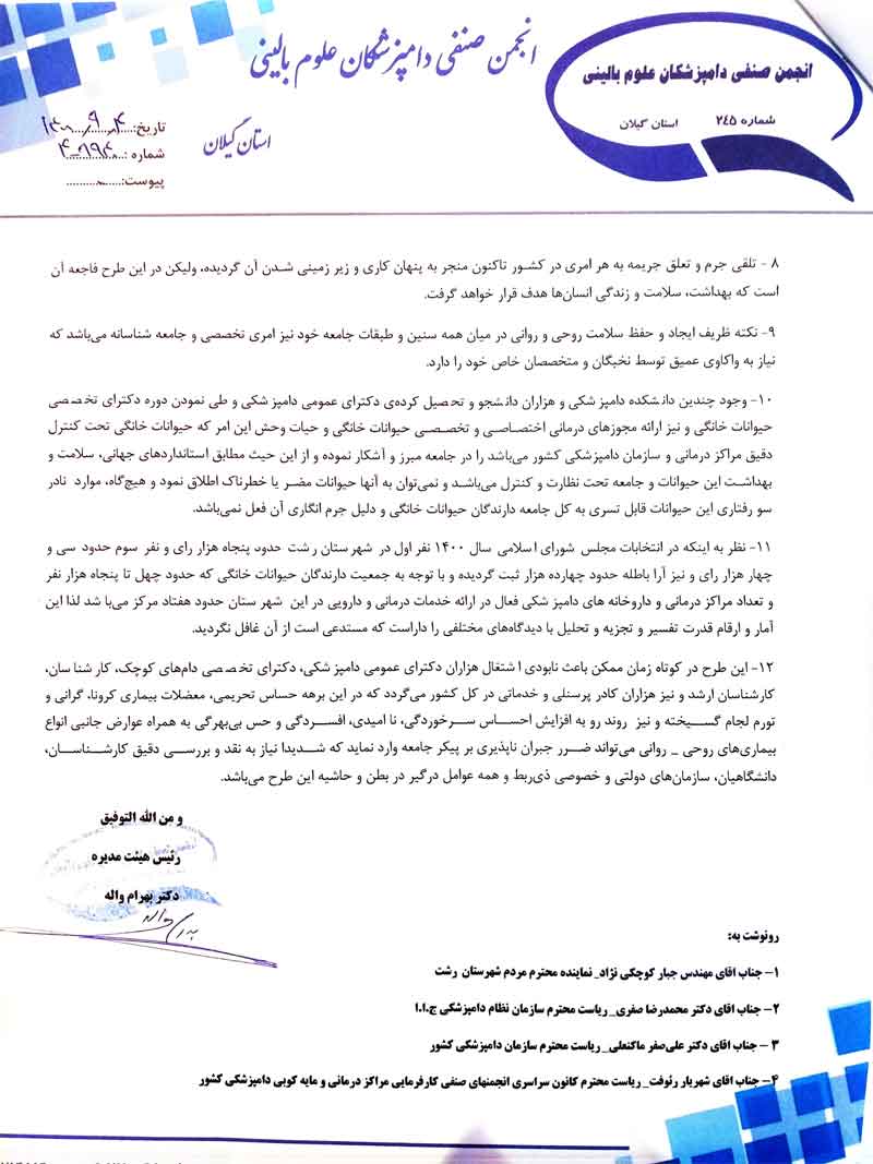 در نامه رئیس انجمن صنفی دامپزشکان علوم بالینی گیلان به رئيس مجمع نمایندگان عنوان شد: