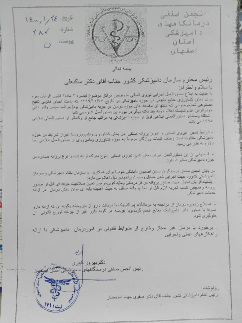 رییس انجمن صنفی درمانگاه های دامپزشکی استان اصفهان طی نامه ای، در جهت اجرای بهتر دستورالعمل اجرایی نیروی انسانی متخصص تبصره 2 ماده 2 قانون افزایش بهره وری پیشنهادهایی را به رییس سازمان دامپزشکی کشور ارائه داد.