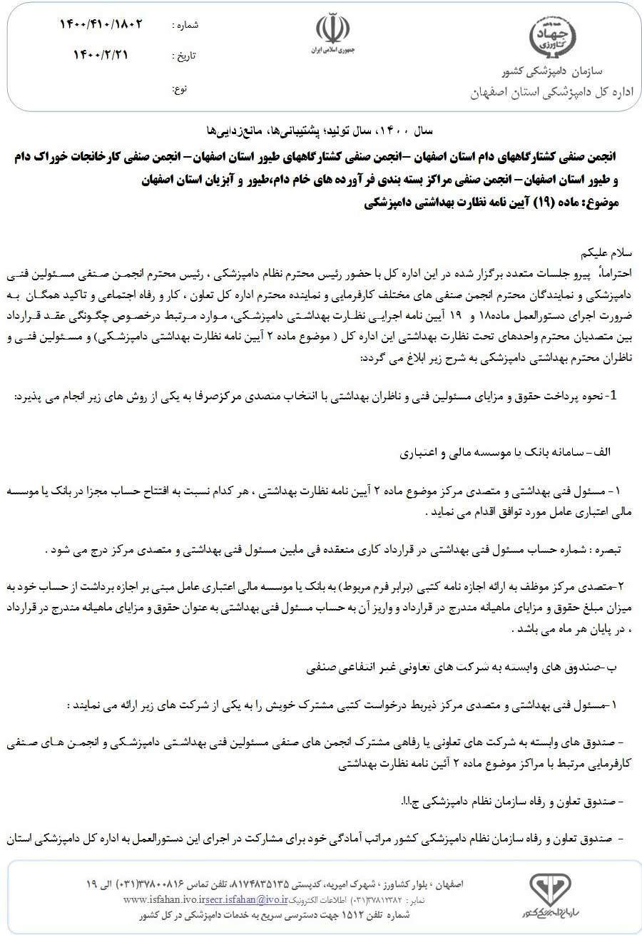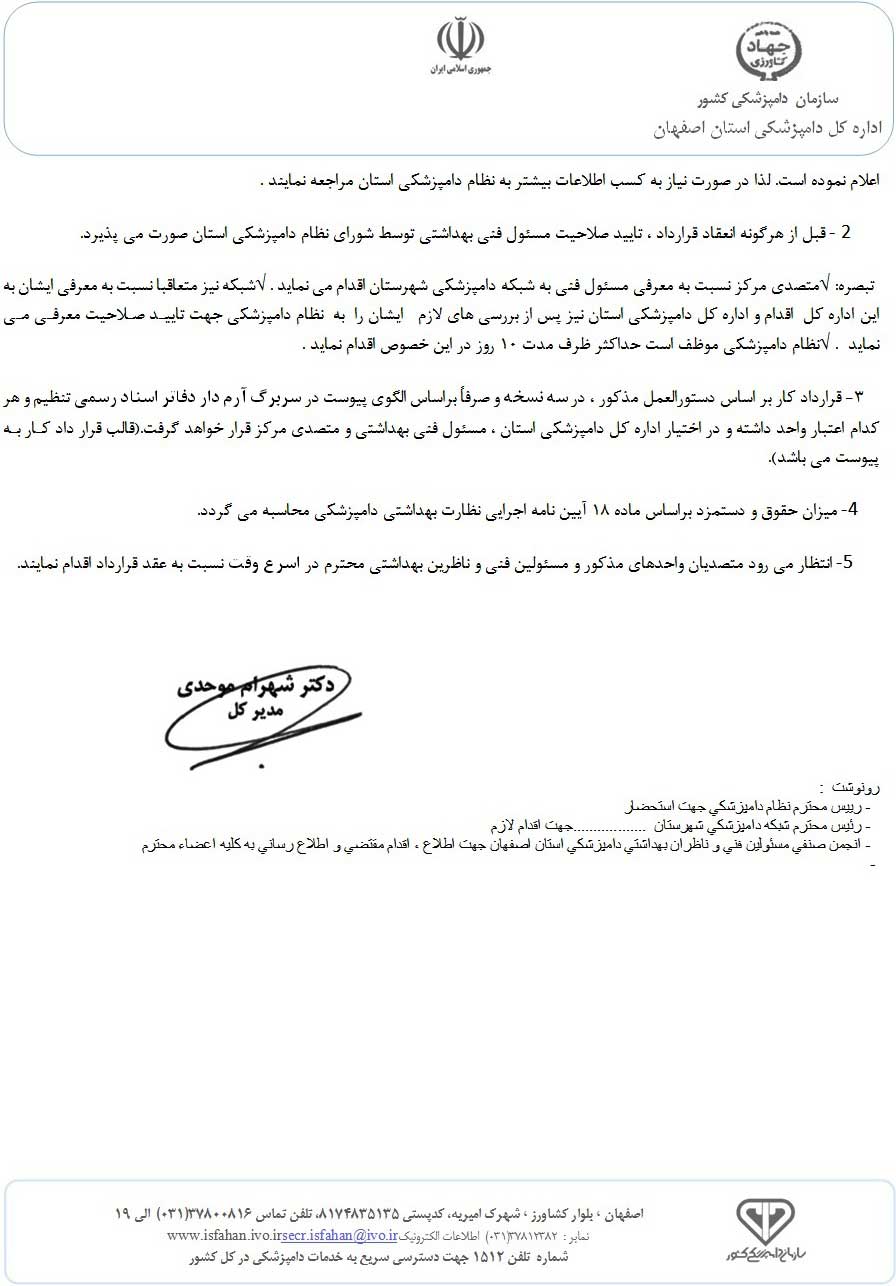 مدیر کل دامپزشکی استان اصفهان در خصوص تعیین روش ها و راهکار انعقاد قراردادهای سال 1400 مسئولین فنی و ناظرین بهداشتی ابلاغیه ای صادر کرد.