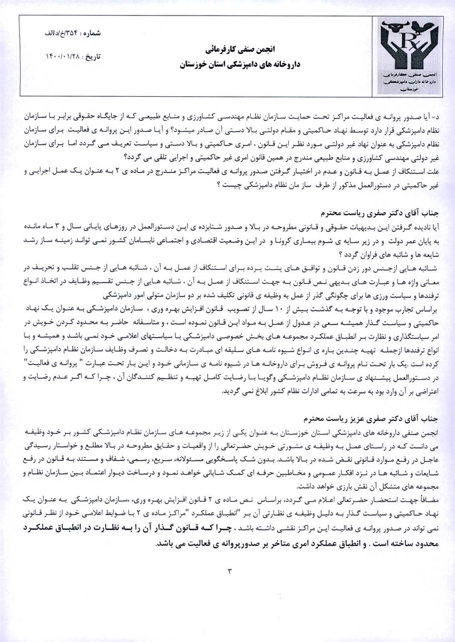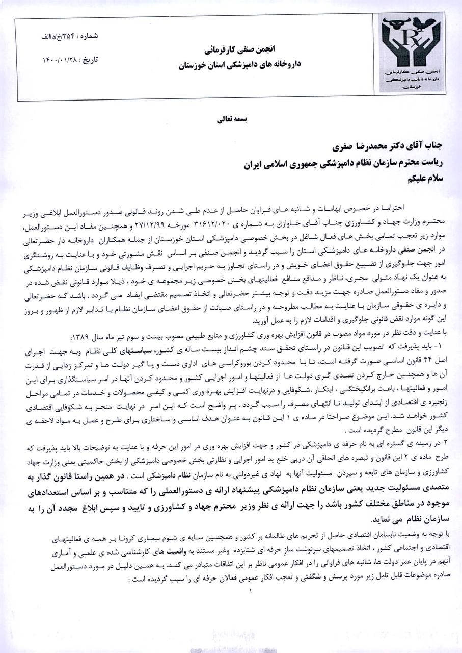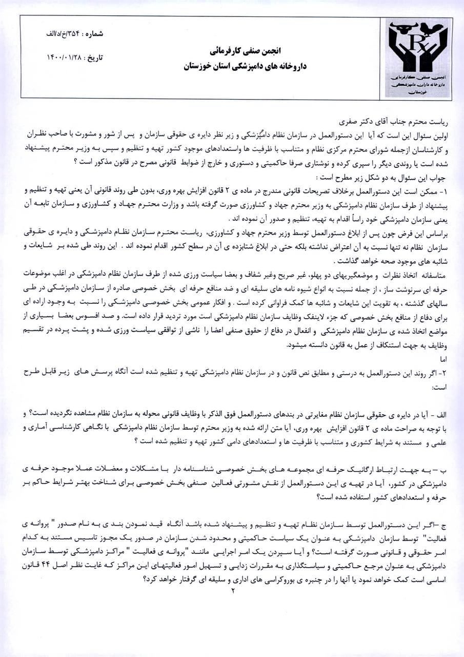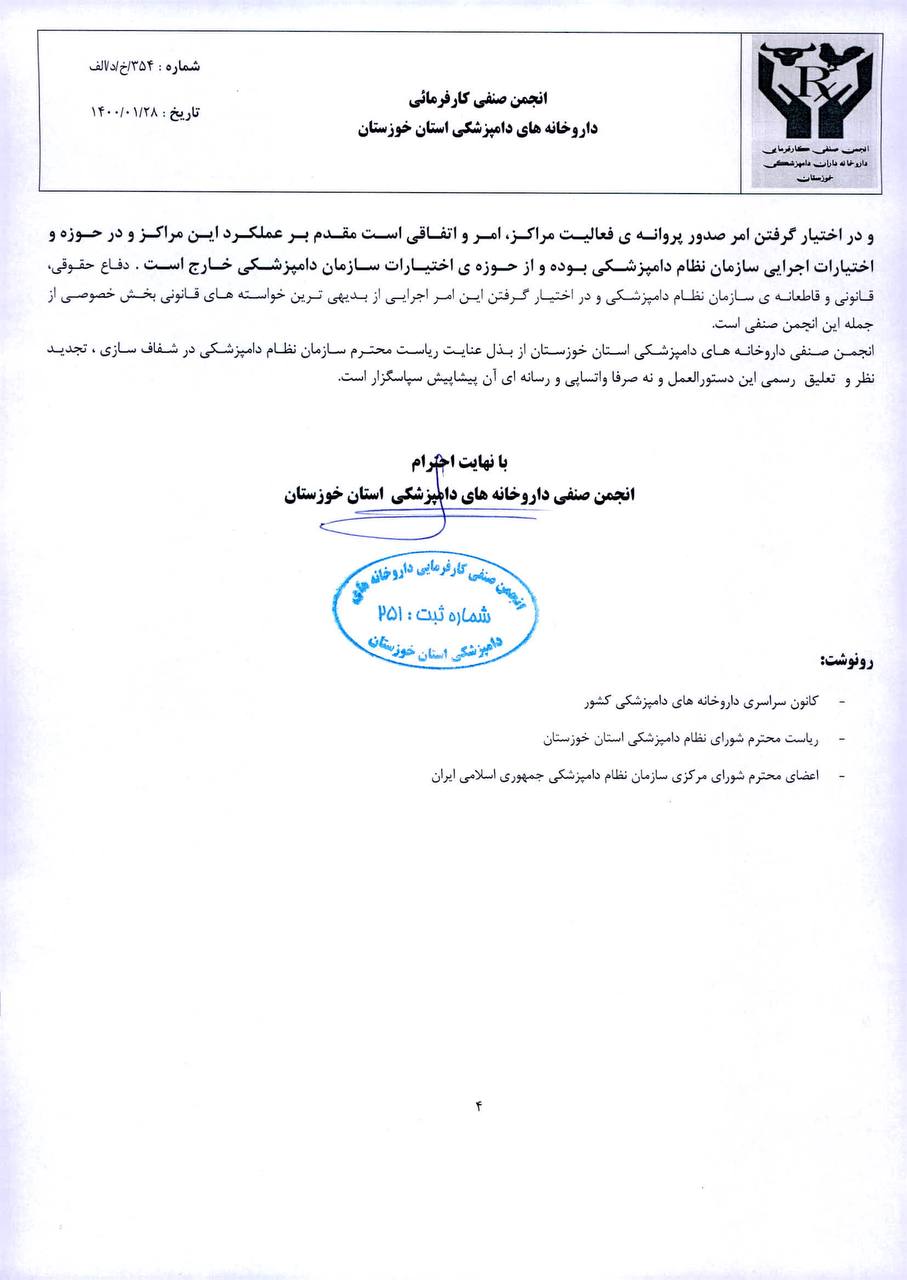 انجمن صنفی کارفرمایی داروخانه های دامپزشکی استان خوزستان طی نامه ای به رییس سازمان نظام دامپزشکی موارد نقض قانون در ماده 2 دستورالعمل را اعلام کرد.